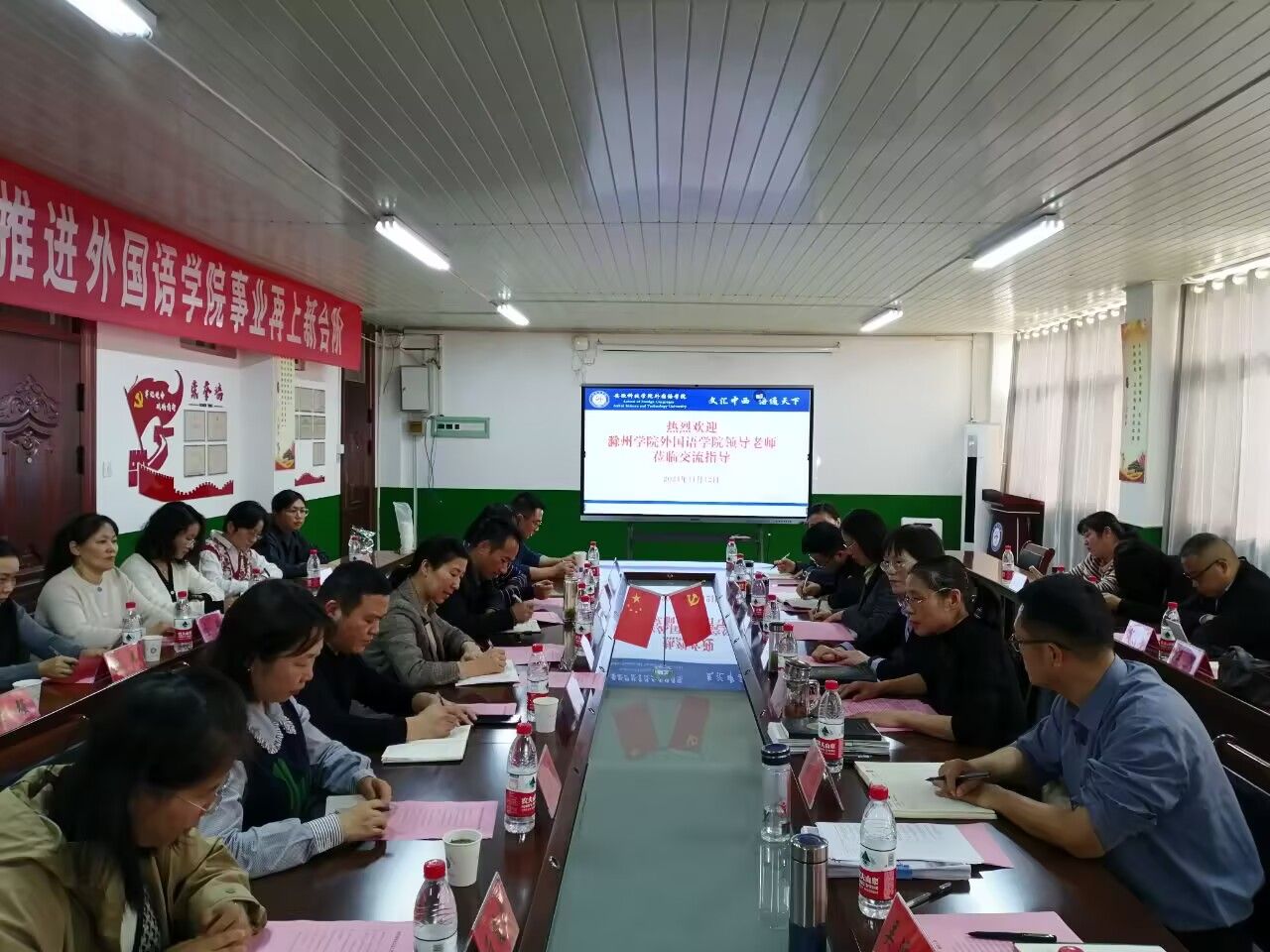 11月12日下午,滁州学院外国语学院院长姚志英、党委书记李琳一行16人到外国语学院交流学习师范类专业认证工作。外国语学院党政领导、英语专业负责人、教研室主任和教师代表参加了交流会。交流会由外国语学院院长刘萍主持。
