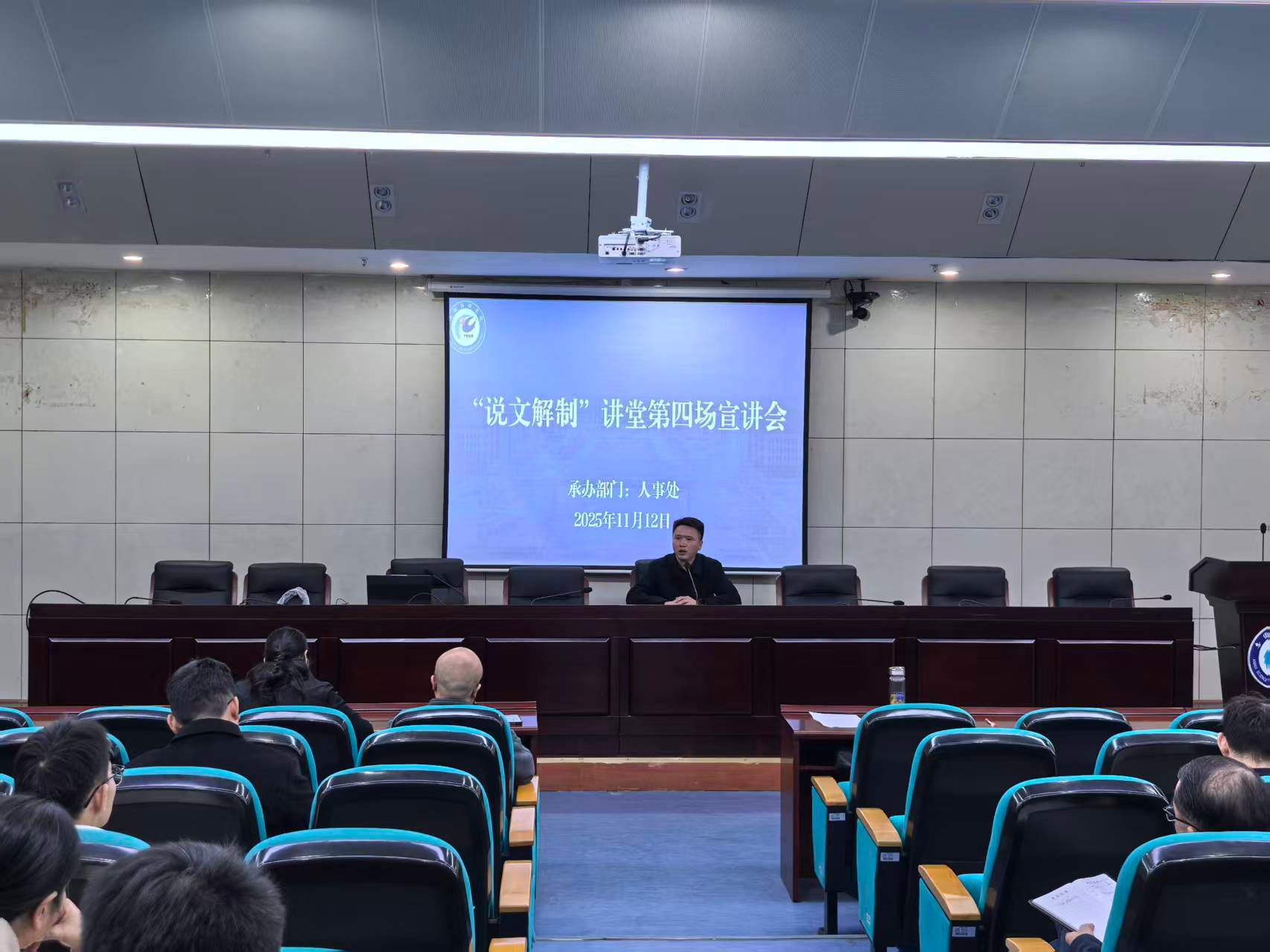 11月12日下午,学校在凤阳校区一楼报告厅举办人事专题“说文解制”宣讲会。党委教师工作部部长、人事处处长、人才工作办公室主任詹学文主讲。