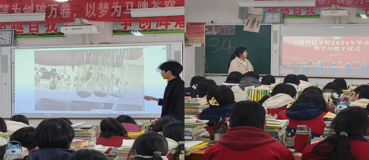 活动前期,他们主动与母校老师对接,结合自身经历精心筹备宣讲内容与物料。宣讲过程中,他通过播放学校招生宣传视频、PPT展示的方式,全面介绍安徽科技学院的办学历史、校园文化、师资力量,重点解读相关专业的特色优势、课程设置与发展前景;同时分享自身高考备考方法、志愿填报经验和丰富多彩的大学生活,耐心解答学弟学妹关于专业选择、备考规划、大学生活等方面的疑问,用真诚与热情为冲刺高考的学子们加油鼓劲。