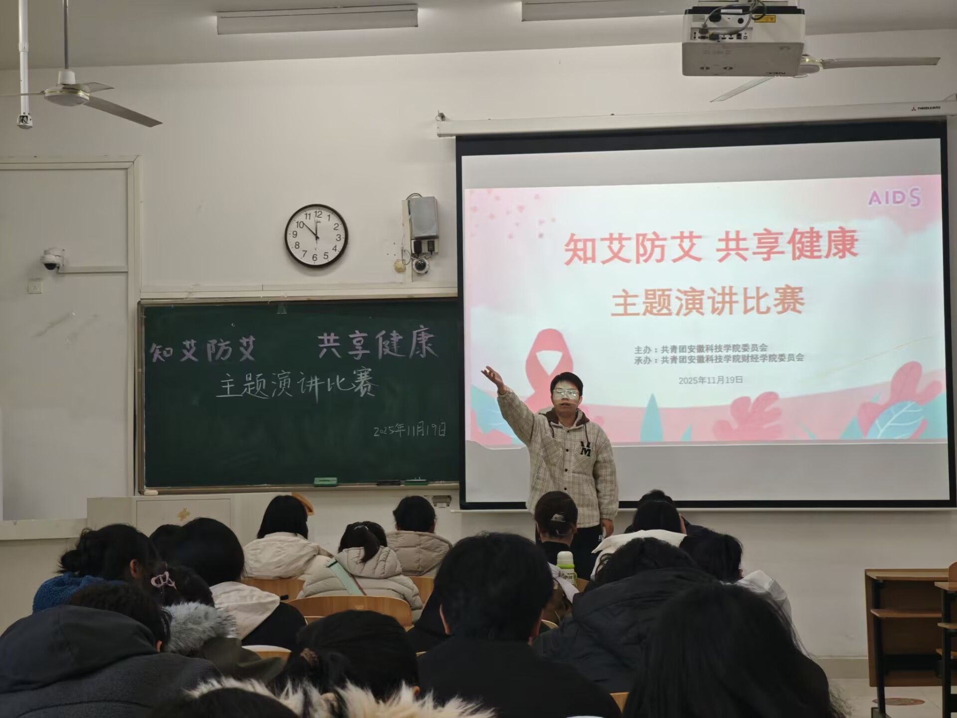 为深入贯彻落实《中国遏制与防治艾滋病规划(2024-2030 年)》精神,切实提升青年学生艾滋病防治认知水平与自我保护能力,10月28日以来,我校以安徽省艾滋病防治宣传教育 “进校园” 旗帜传递活动为契机,联动蚌埠市疾病预防控制中心,由校团委主办,财经学院承办,开展了为期一个月的防艾宣传教育系列活动,通过主题团日、联学联建、演讲比赛、答题竞赛等多元形式,构建 “医校协同、师生参与、全域覆盖” 的防艾工作格局,让防艾知识深植校园,让健康理念点亮青春。