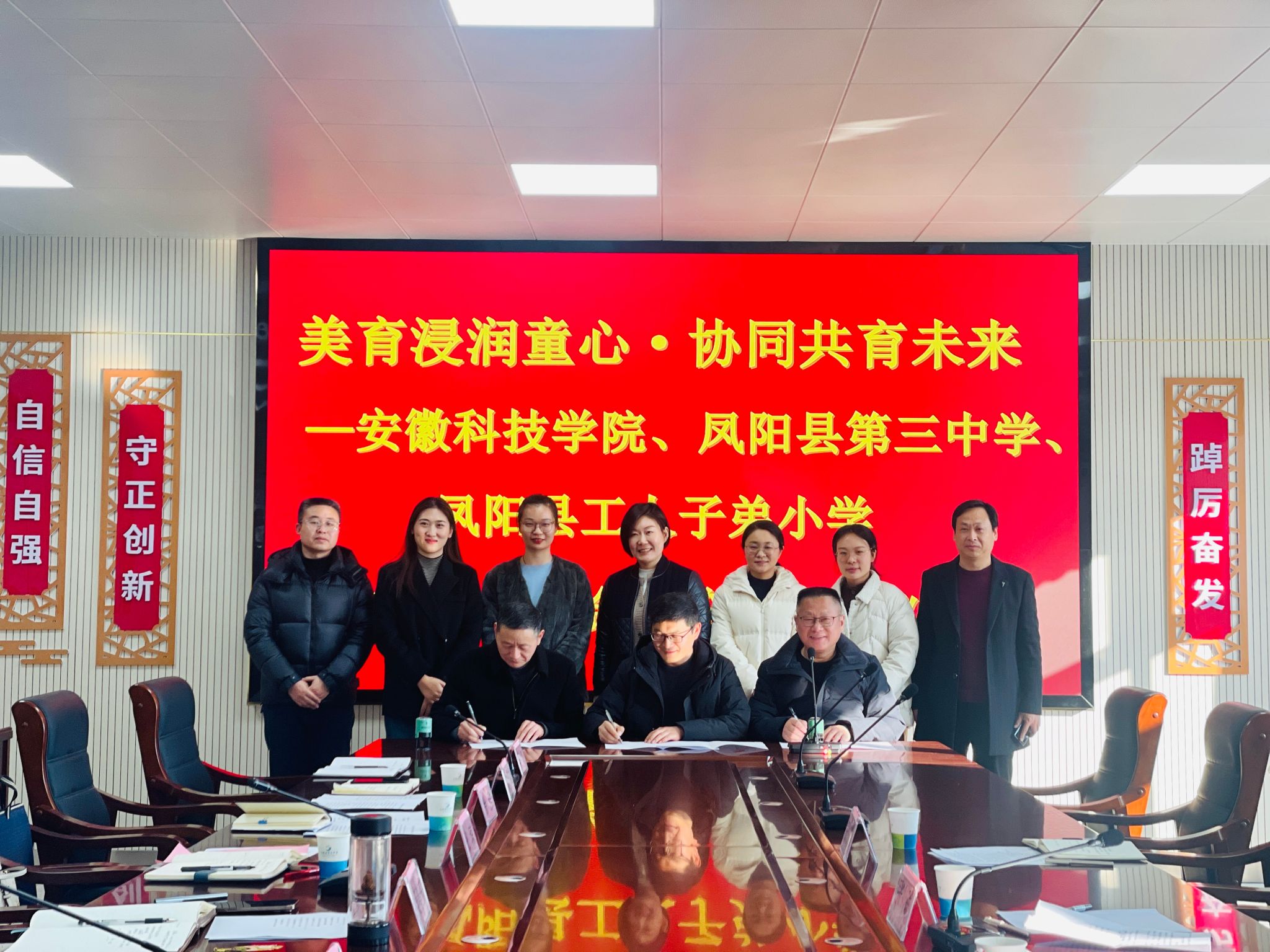 “美育是培根铸魂、润泽心灵的重要途径,是落实立德树人根本任务的关键一环。”校团委书记张聪在致辞中强调,学校始终坚守“为党育人、为国育才”的初心使命,高度重视以美育促德育、以艺术润人心的育人功能,积淀了丰富的学生社团资源、专业的艺术教育力量和深厚的志愿服务传统。此次结对合作,是学校积极响应国家美育浸润行动、推动大中小学美育衔接贯通的有力实践。学校将充分发挥高校在人才、创意、活动组织等方面的优势,与中小学美育需求精准对接,围绕凤阳花鼓、凤画等地方优秀传统文化及非遗资源,开发一批有意义、有趣味、有深度的美育微课程与实践项目,通过资源共享、平台共建、活动共办、成果共赢,让“为党育人、为国育才”的初心扎根凤阳大地。