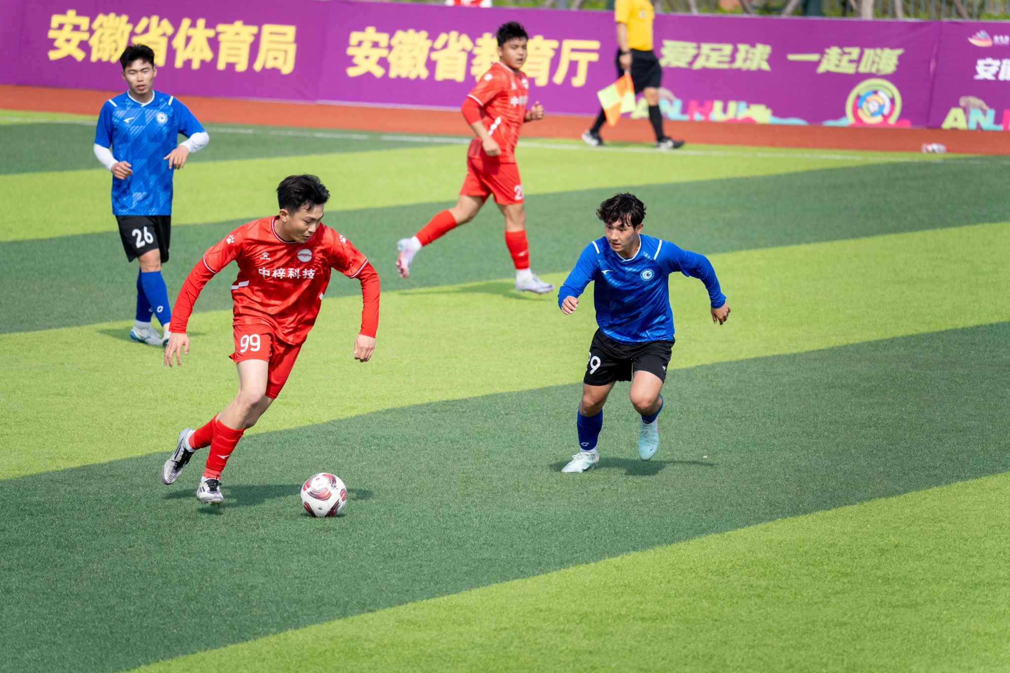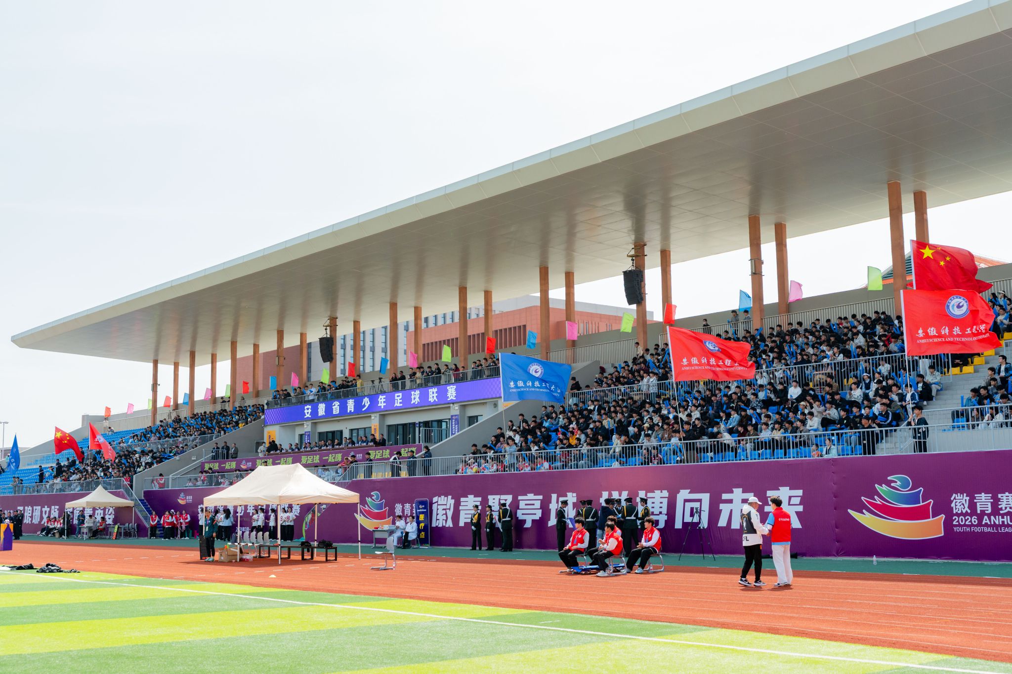 春意正浓,逐梦绿茵。3月28日下午,安徽省青少年足球联赛大学组第二轮我校主场对阵合肥工业大学的比赛在滁州校区开赛。我校党委委员、副院长王玉和,安徽省学校体育协会副理事长、赛区比赛监督陈有忠,滁州市委教体工委委员、市教体局副局长都兰·沙格尼西,滁州市南谯区区委常委、副区长王勇,滁州市南谯区区委常委、纪委书记、监委主任舒立根,合肥工业大学体育部副主任李晓峰等领导嘉宾出席开赛仪式。
