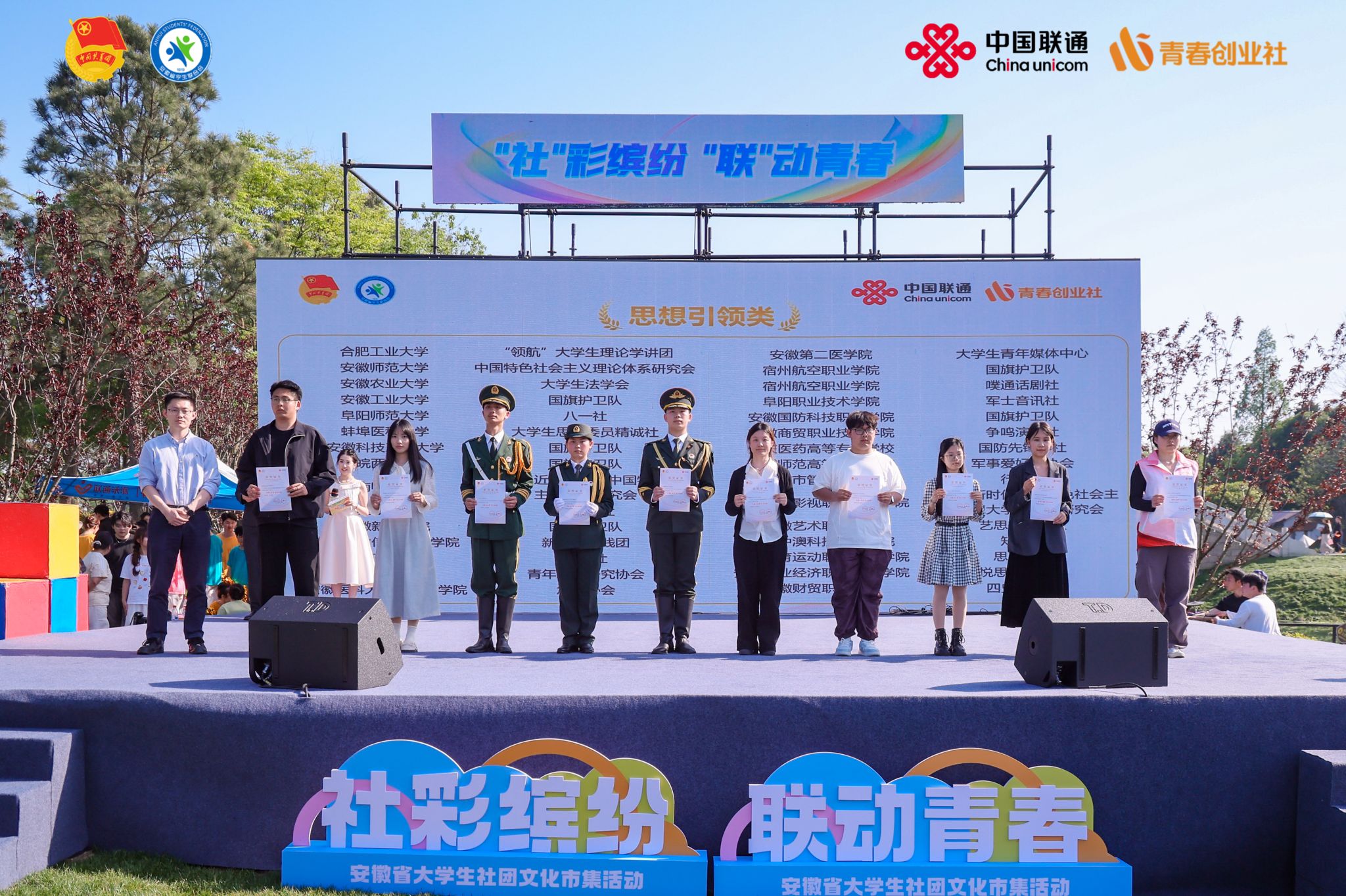 4月18日至19日,由共青团安徽省委、安徽省学生联合会主办的“‘社’彩缤纷‘联’动青春”安徽省大学生社团文化市集在合肥市举办。作为2026年度安徽高校校园文化建设重点品牌活动,汇聚全省百余所高校优秀社团,覆盖非遗传承、文创展示、学术科创、文体互动、志愿服务等多个领域,是集中展示高校社团育人成果、促进青年交流互鉴、推动校园文化高质量发展的省级青春文化盛会。我校大学生花鼓艺术团、国旗护卫队两大特色社团受邀精彩亮相,并在2025—2026学年安徽省高校“活力社团”风采展中获评省级“活力社团”。