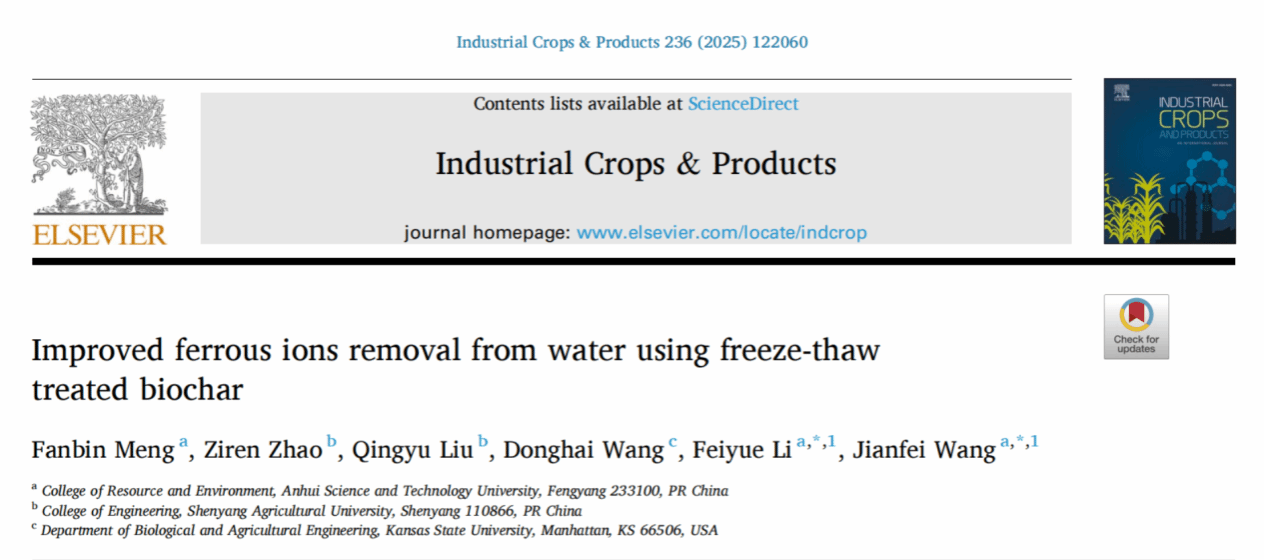 近日,我校资源与环境学院孟凡彬副教授及其合作团队,在功能性生物炭去除铁离子方面取得重要突破。相关研究成果以“Improved ferrous ions removal from water using freeze-thaw treated biochar”为题,发表于农林学科领域顶级期刊《Industrial Crops & Products》(中国科学院1区top期刊,影响因子6.2)。