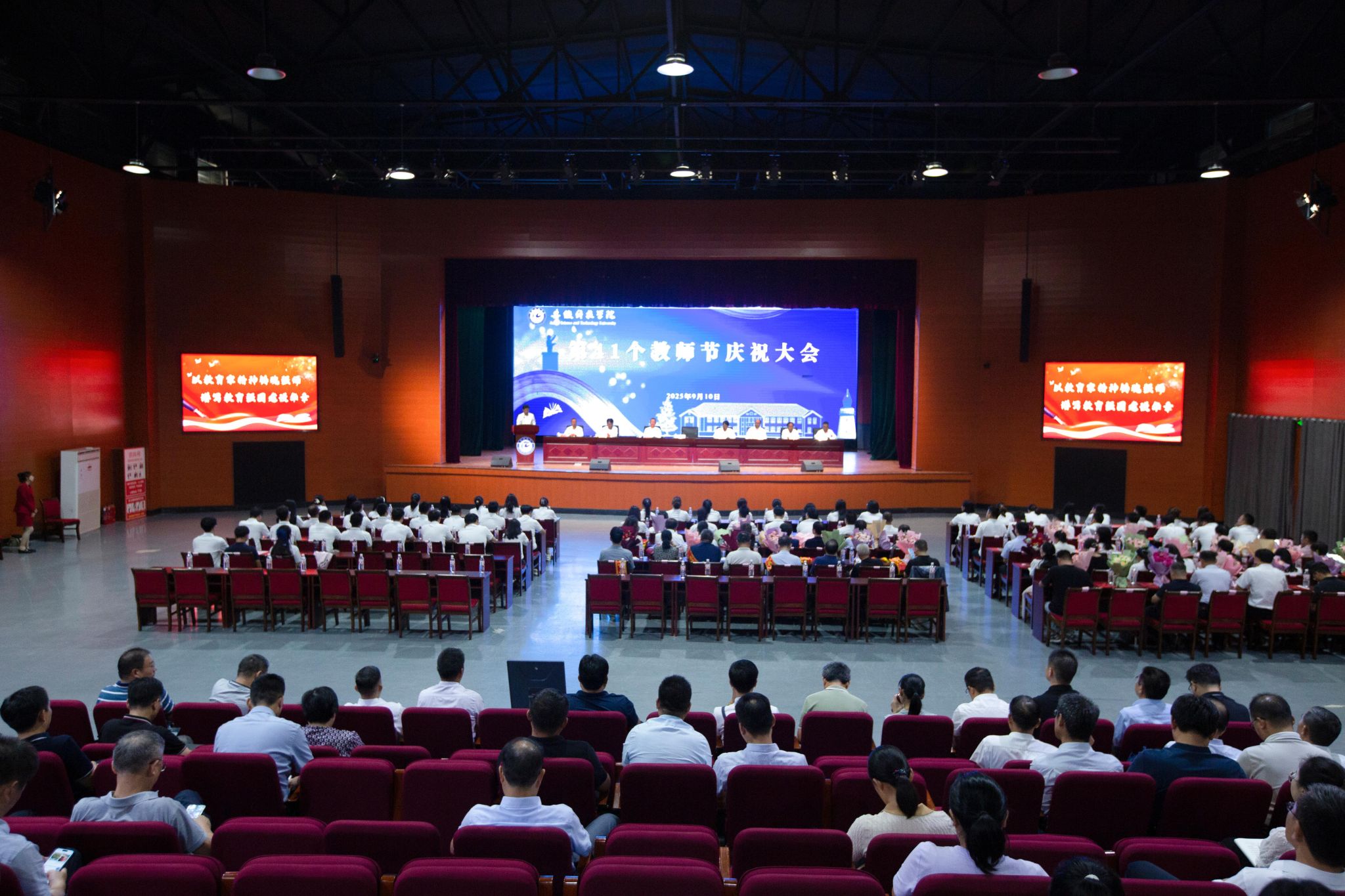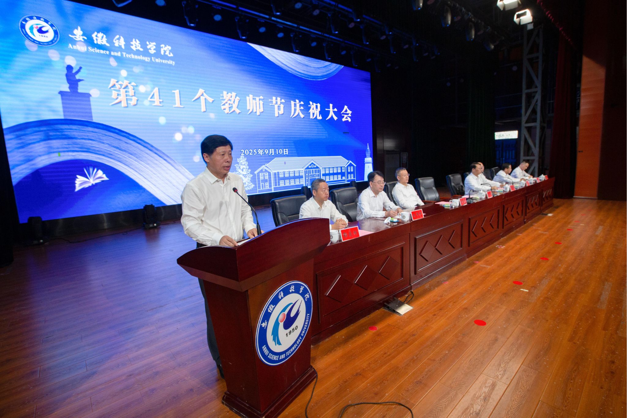 9月10日下午,学校在凤阳校区大学生活动中心召开2025年教师节庆祝大会,党委书记时伟,党委副书记、院长李升和,党委副书记曹付忠,党委委员、副院长王孝义,党委委员、副院长赵伟峰,党委委员、副院长王玉和,党委委员、纪委书记、监察专员彭庆刚,党委委员、副院长方鸣出席大会并在主席台就座。会议由李升和主持。