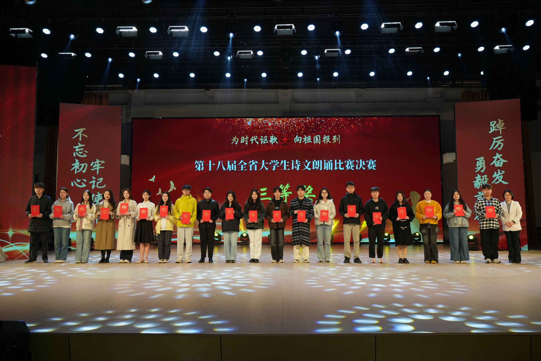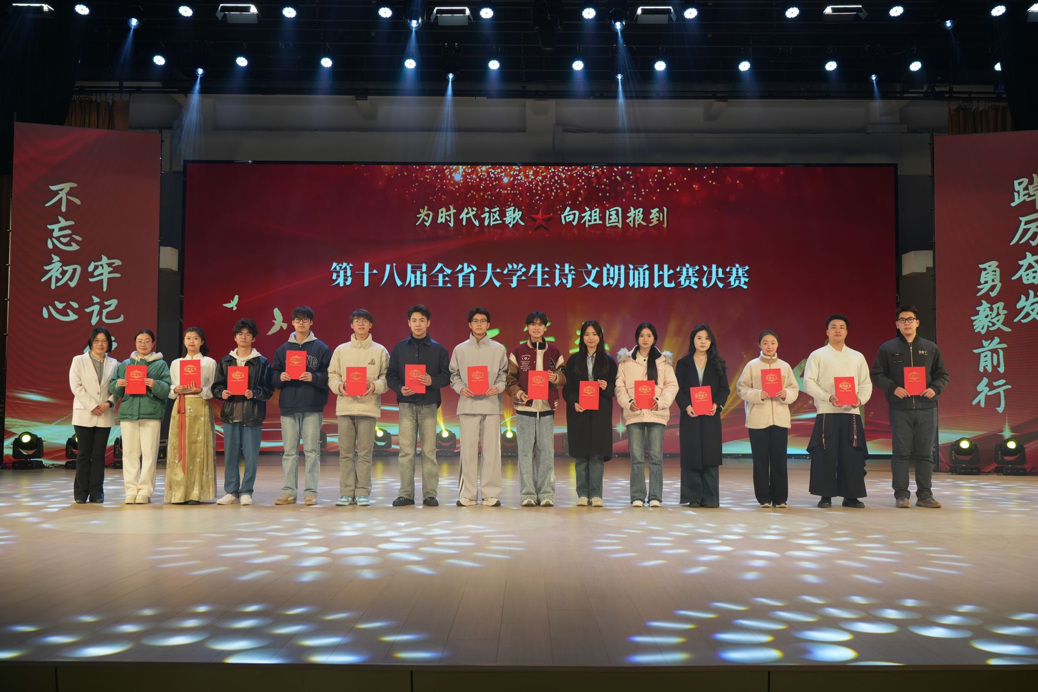 本届赛事以“为时代讴歌,向祖国报到”为主题,经过严格选拔和专业训练,全省35所高校共60组选手参加总决赛角逐。我校选手在指导教师团队的精心打磨下,通过校内选拔赛、赛前模拟训练等环节,最终在省级舞台上展现出卓越的艺术表现力。