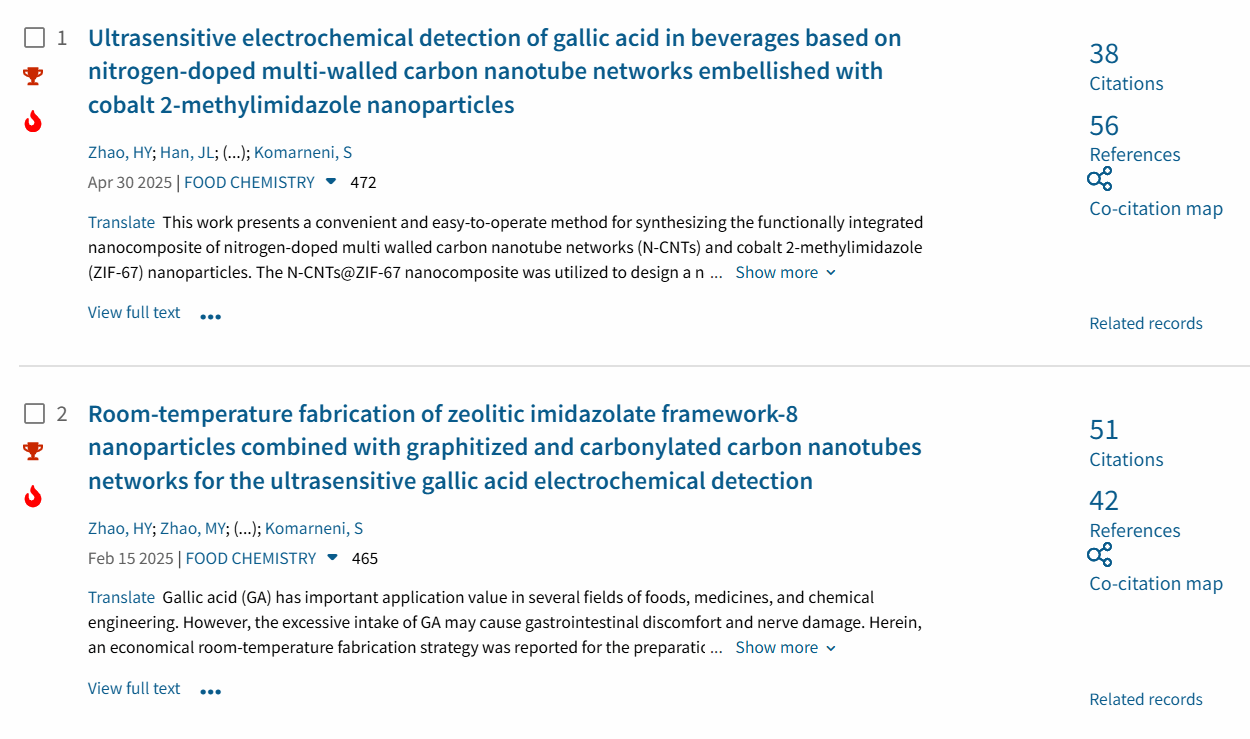 近日,Essential Science Indicators(ESI)公布最新统计数据,我校化工新材料灯塔团队在国际顶级学术期刊《Food Chemistry》(中科院农林科学大类一区TOP期刊,IF=9.8)发表的两篇高水平研究论文《Ultrasensitive electrochemical detection of gallic acid in beverages based on nitrogen-doped multi-walled carbon nanotube networks embellished with cobalt 2-methylimidazole nanoparticles》和《Room-temperature fabrication of zeolitic imidazolate framework-8 nanoparticles combined with graphitized and carbonylated carbon nanotubes networks for the ultrasensitive gallic acid electrochemical detection》分别同时入选ESI全球TOP 1.0%高被引论文(Highly Cited Papers)和Top 1‰热点论文(ESI Hot Papers)。