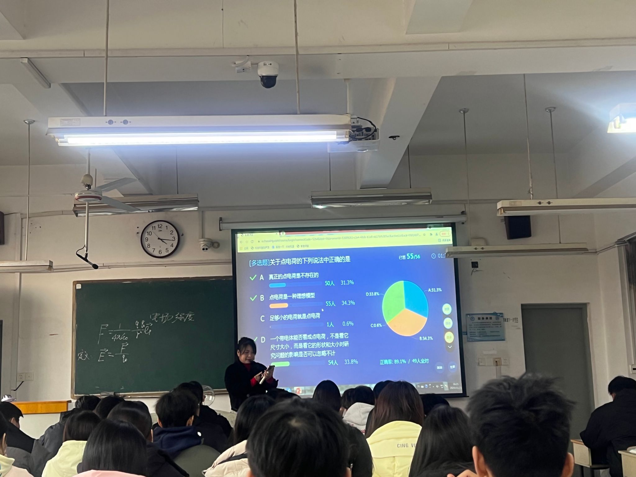 刘念围绕“电场强度”主题,系统讲解了基础概念、计算公式及其物理意义,涵盖点电荷电场、连续分布电荷的叠加原理等核心环节。课堂伊始,她创新性地通过魔法球实验演示静电现象——魔法球在高频电场下放电产生的绚丽光芒直观揭示电场存在;随后,借助会跳舞的小猪模型,生动模拟电场力对物体的影响,将抽象理论转化为可视场景,激发学生兴趣。在理论教学中,刘念结合随堂练习强化学生对库仑定律与电场强度公式的理解,并引导学生探讨电场强度在工程安全中的实际应用。课堂互动频繁,氛围活跃热烈,既有理论深化又有实践启发。