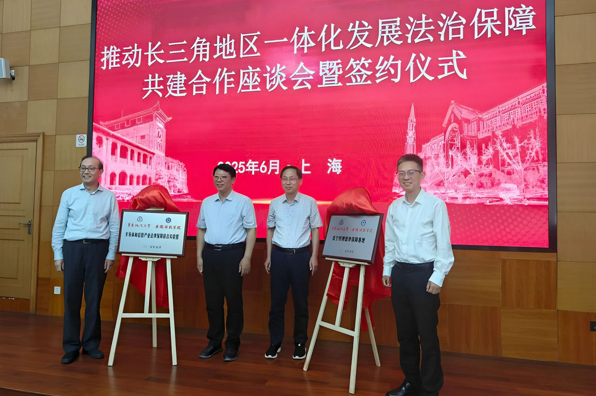 6月5日下午,校党委副书记、院长李升和,党委委员、副院长王玉和前往华东政法大学长宁校区,出席推动长三角地区一体化发展法治保障共建合作座谈会暨签约仪式。李升和代表学校签署《长三角地区一体化发展法治保障共建合作框架协议》。李升和、王玉和与其他嘉宾共同为“低空经济法律保障基地”“半导体和信息产业法律保障联合实验室”揭牌。李升和还为特聘教授、兼职教授颁发了聘书。仪式由华东政法大学党委副书记、副校长虞潇浩主持。