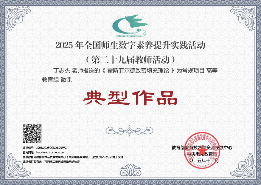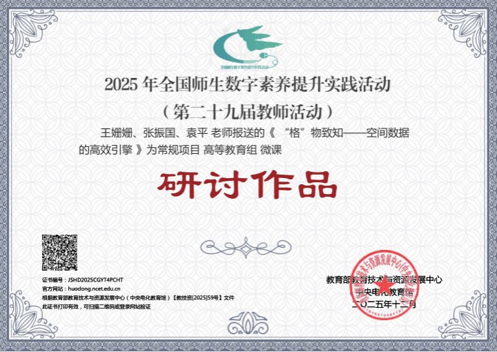 近日,在教育部教育技术与资源发展中心(中央电化教育馆)主办的2025年全国师生信息素养提升实践活动(第二十九届教师活动)中,化学与材料工程学院丁志杰老师的微课《霍斯菲尔德致密填充理论》被评为典型作品,资源与环境学院王姗姗、张振国、袁平团队的微课《“格”物致知——空间数据的高效引擎》被评为研讨作品。