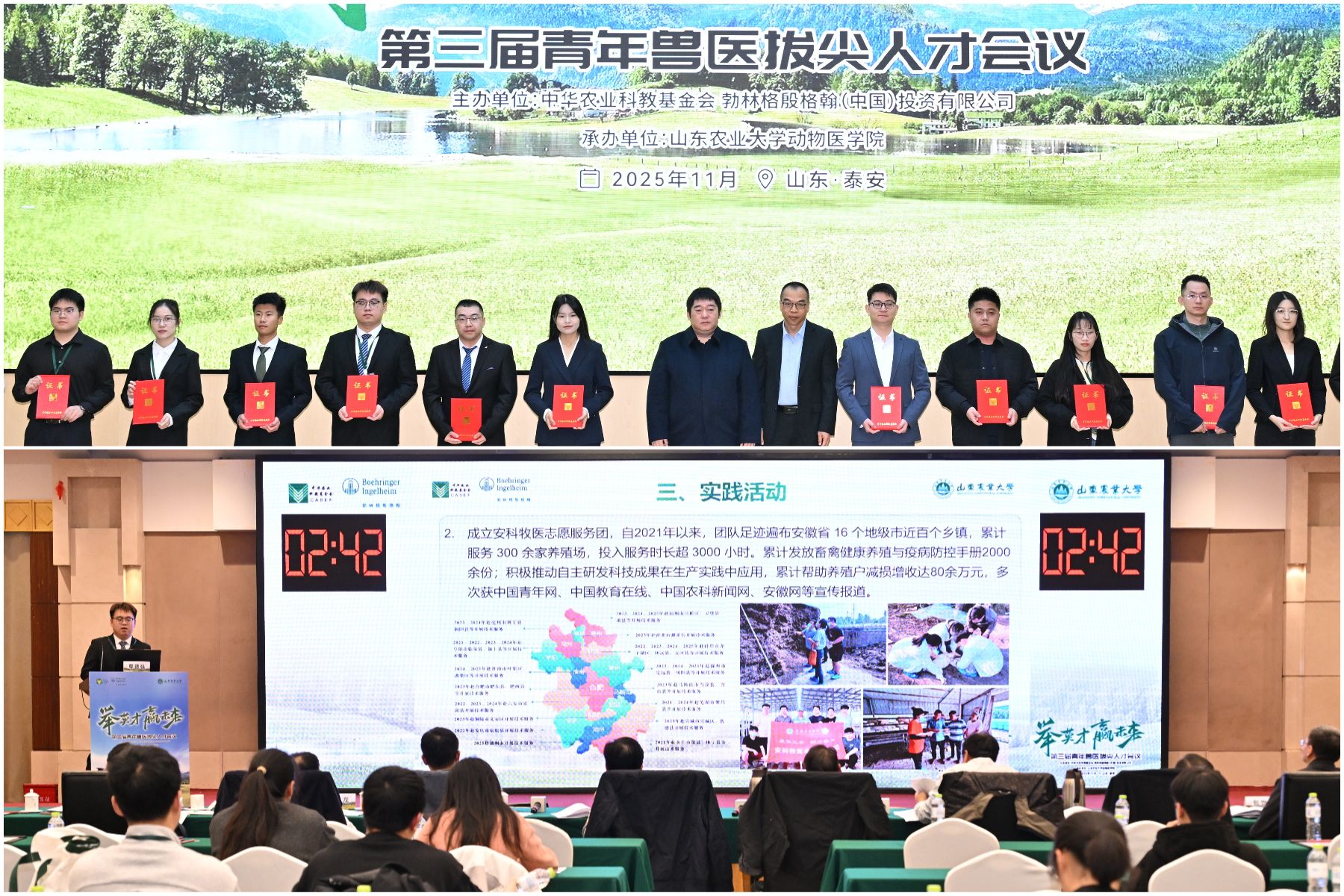 11月1日至2日,全国第三届青年兽医拔尖人才大会在山东泰安成功举办。我校2024级兽医专业研究生鄢德强、2023级兽医专业研究生王泽楷成功入围现场终审,其中,2024级兽医专业研究生鄢德强获评“青年兽医拔尖人才”称号,实现我校在该奖项上的首次突破。