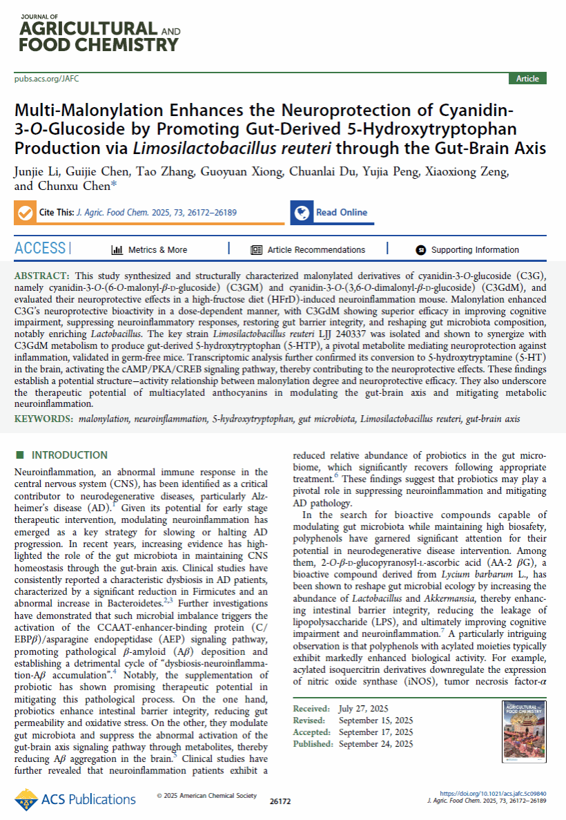 近日,我校食品科学与工程学院分子加工与精准营养实验室陈春旭副教授团队在美国化学学会期刊《Journal of Agricultural and Food Chemistry》(中科院一区TOP,IF 6.2)最新一期(2025,Volume 73, Issue 41)发表封面论文《Multi-Malonylation Enhances the Neuroprotection of Cyanidin-3-O-Glucoside by Promoting Gut-Derived 5-Hydroxytryptophan Production via Limosilactobacillus reuteri through the Gut-Brain Axis》。第一作者为李俊杰硕士,通讯作者为陈春旭副教授,安徽科技学院为第一署名单位。该文是陈春旭副教授团队近年来在Journal of Agricultural and Food Chemistry上发表的第5篇论文,也是该团队第2次登上该期刊的封面。
