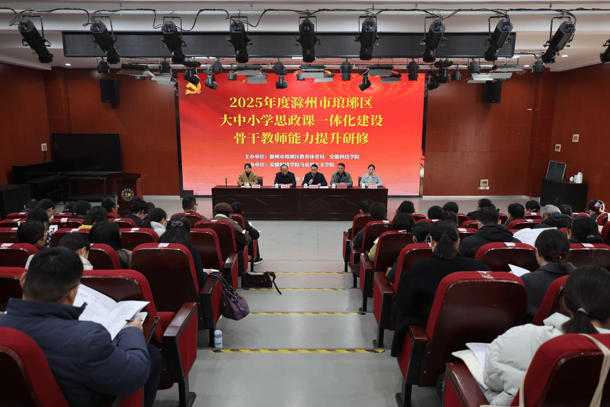 12月1日至9日,由安徽科技学院、滁州市琅琊区教育体育局联合主办,马克思主义学院承办的“2025年度滁州市琅琊区大中小学思政课一体化建设骨干教师能力提升研修班”顺利举办。滁州市琅琊区教体工委副书记贾开华、区教师发展中心副主任周晓妹等出席开班仪式,安徽科技学院马克思主义学院书记杨仕勇主持。来自琅琊区中小学的101名思政课骨干教师共赴此次研修,通过专题学习、教学展示、现场研学等多种形式,共探思政育人新路径,共绘铸魂育人同心圆。