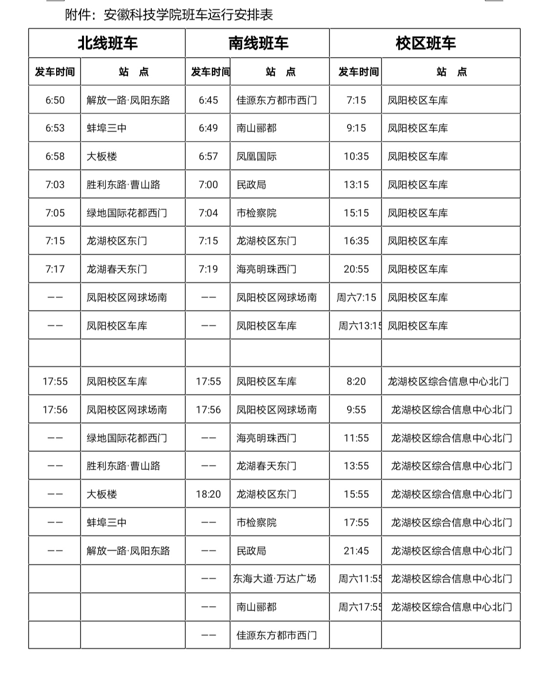 1.3月1-6日,南、北线班车各站点按《班车运行安排表》早上推迟15分钟发车,晚上提前15分钟发车;校区班车运行时间为:凤阳校区车库7:30、13:30,龙湖校区综合信息中心北门12:00、17:40。