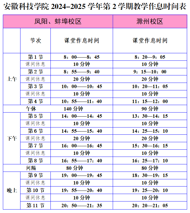 安徽科技学院2024-2025学年第2学期教学作息时间表