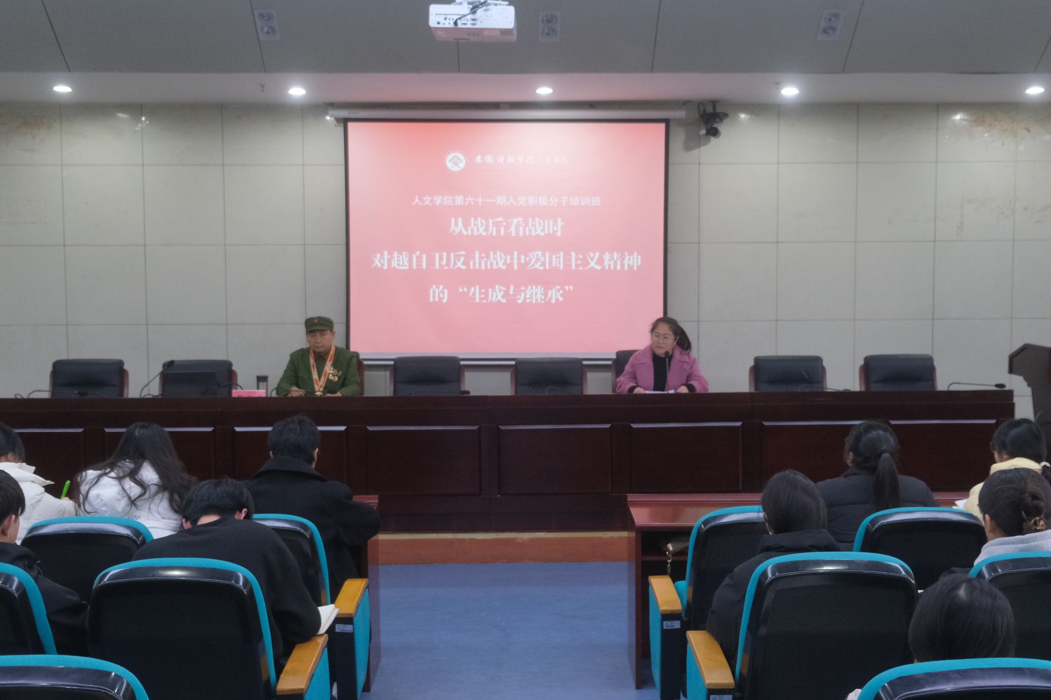 为引导入党积极分子端正入党动机、坚定理想信念,切实把好党员发展“入口关”,上好入党“第一课”,全面提升政治素养和理论修养,厚植爱国主义情怀,根据人文学院党校第六十一期入党积极分子培训班教学安排,11月27日下午,人文学院邀请凤阳籍对越自卫反击战老战士、一等功臣郑世柱同志,来校为学生入党积极分子讲授专题党课暨国防教育报告会。报告会在凤阳校区会议中心一楼报告厅举行,人文学院党委副书记、纪委书记李沙娜主持。