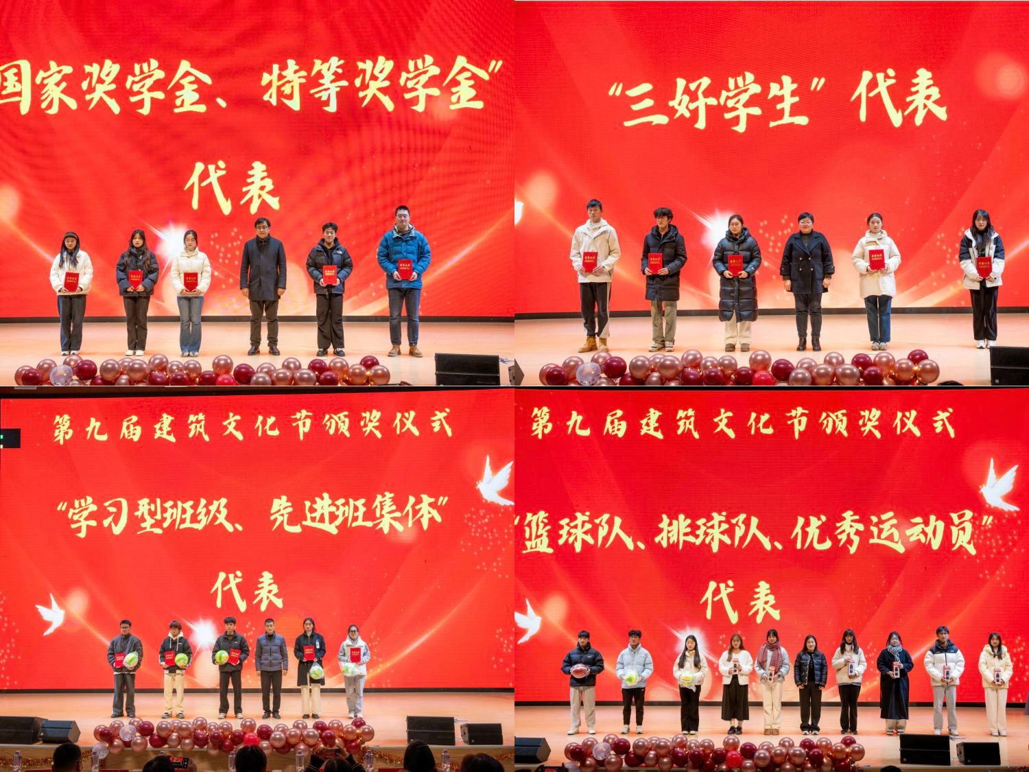 闭幕式上,通过开场视频,回顾了第九届建筑文化节自2024年3月启动以来,围绕学生“德智体美劳”先后开展的“立德铸魂、促学益智、强体育心、炼技蕴美、崇劳践行”等五大板块中的精彩瞬间和取得的成绩,走出了一条具有建筑特色、不断创新的校园文化品牌之路,启迪了同学们的思想和才智,锻炼了同学们的才艺和特长等。同时,学院领导和老师分别为在第九届建筑文化节立德、益智、体育、美育和社会实践中表现突出的集体和个人颁发了证书、奖品,并进行了合影留念。