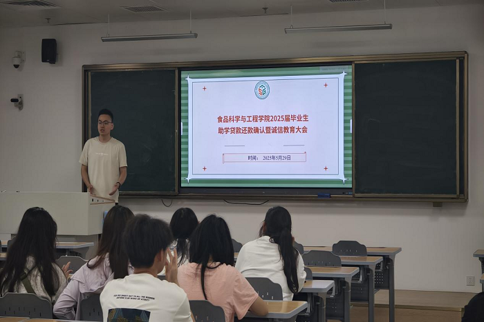 5月29日,食品科学与工程学院在学思楼4号楼102教室召开2025届毕业生助学贷款还款确认暨诚信教育会议,学院资助工作负责人曹子健以及2025届助学贷款毕业生参会。