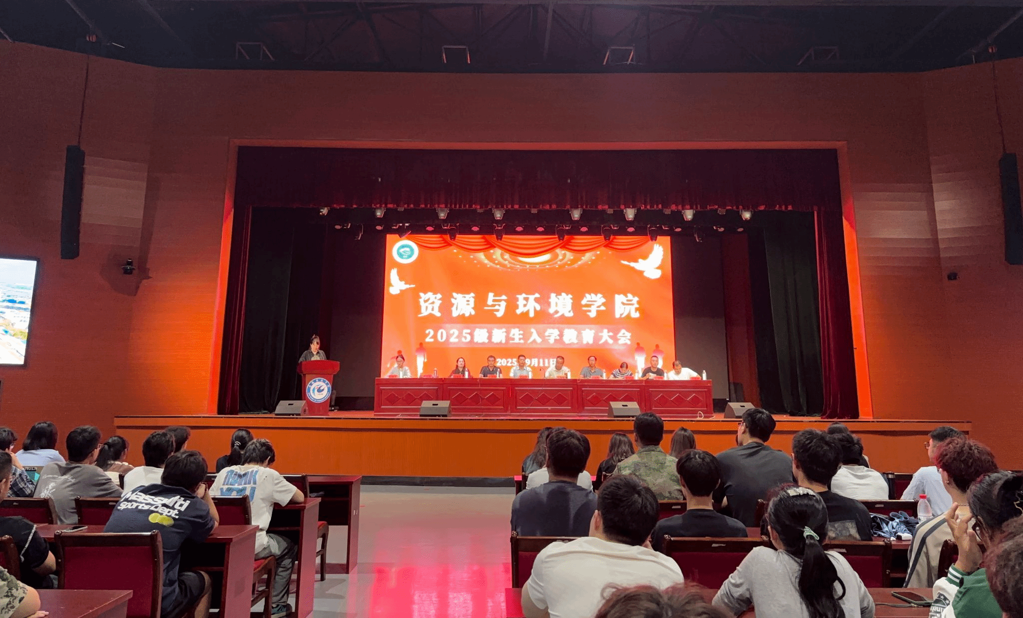 为帮助新生尽快适应大学生活、明确发展方向,9月11日晚,资源与环境学院在大学生活动中心举行2025级新生入学教育大会。学院党政领导、全体辅导员、教师代表以及2025级本硕新生和老生代表共同参会。大会由学院党政办公室主任吴国良主持。