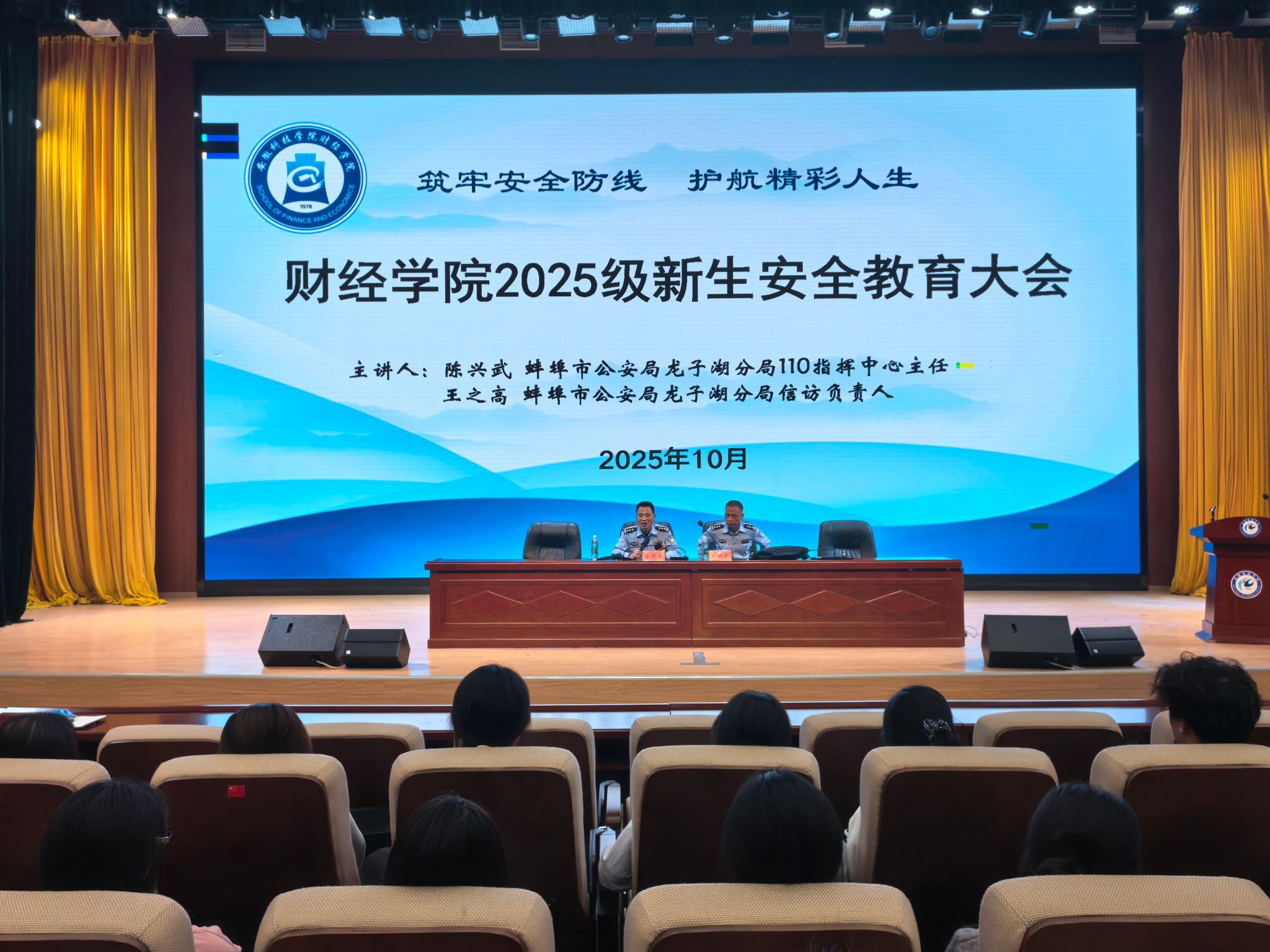 为增强2025级新生安全防范意识,筑牢新生校园安全防线,10月11日,财经学院在东辅楼二楼报告厅召开2025级新生安全教育大会。会议由学院党委副书记耿广汉主持,蚌埠市公安局龙子湖分局110指挥中心主任陈兴武、分局信访负责人王之高主讲,2025级辅导员及全体新生参会。