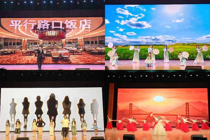 学院党委书记付光玺深情献上《草原上升起不落的太阳》,深切表达了对学院高质量发展的殷殷期望;歌伴舞《逐梦》勾勒出青春追梦者的炽烈情怀;情景剧《平行路口饭店》通过时空叠影的戏剧架构,启示学子们要珍惜当下;朗诵《食光·启程》声声入耳,满载昔日回忆,引领师生坚定信心踏向未来;古典舞《采茶》以翩跹流转的水袖,在虚实相生的舞步中勾勒茶山云雾,千年茶韵随裙裾翻飞绵延不息;情景歌曲串烧《光影交织·伴你“童”行》运用蒙太奇叙事,童声清唱与光影装置碰撞出穿越时空的温情记忆;青春舞蹈《再次重逢的世界》以迸发式舞步解构重组空间,肢体碰撞间迸射出重逢的悸动与希冀;歌伴舞《万疆》借唯美大气的词曲和舞蹈,抒发了食院学子质朴真挚的爱国情怀。最后,晚会在师生代表合唱《唱支山歌给党听》的赤子之声中缓缓落幕。