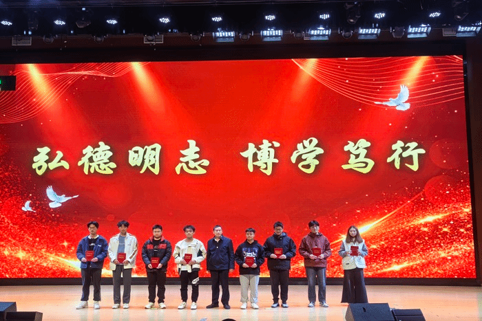 第一篇章《弘德明志,博学笃行》,由主持人宣布第三届“电创未来”文化节科创比赛类、学科竞赛类、艺术赛事类、学党史、体育赛事类活动获奖学生名单,学院领导班子为获奖同学颁奖并合影留念。