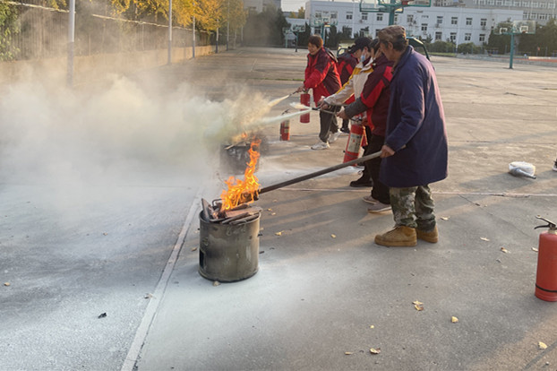演练前,王婉兴细致讲解了物业服务人员日常巡查检查的要点;普及了校园火灾的常见原因及其危害、预防措施;阐述了初起火灾扑救方法、报火警的注意事项等;演示了灭火器与消防水带的正确使用方法。演练中,培训人员按照“一提、二拔、三握、四压”的使用口诀,手持灭火器,对准火源根部,果断按下压把,实施精准喷射,成功扑灭了火源,展现出良好的实战技能。