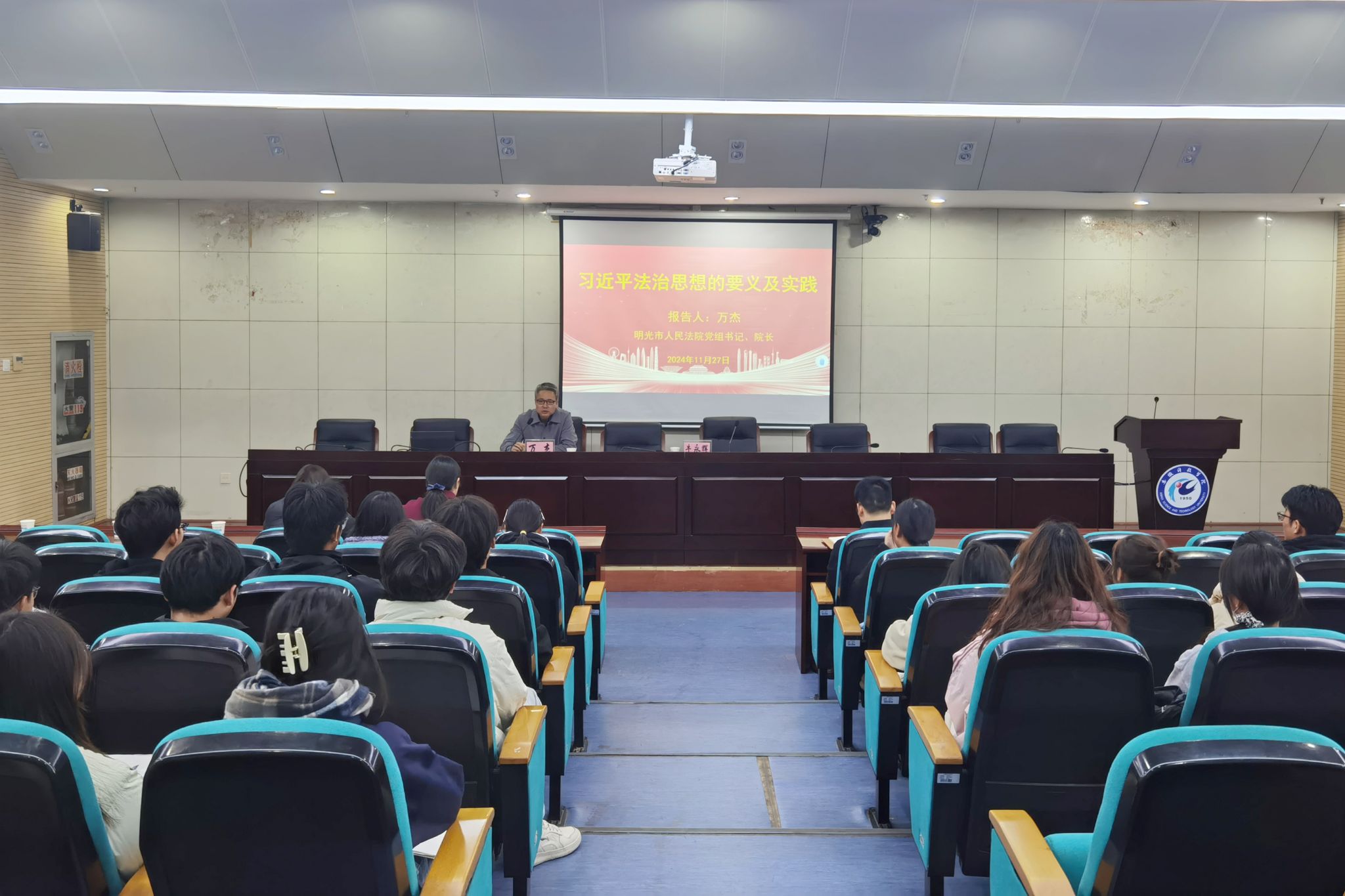 11月27日下午,明光市人民法院党组书记、院长万杰应邀来校作学术报告。法学专业2024级学生参加,报告会由人文学院副院长牛永辉主持。