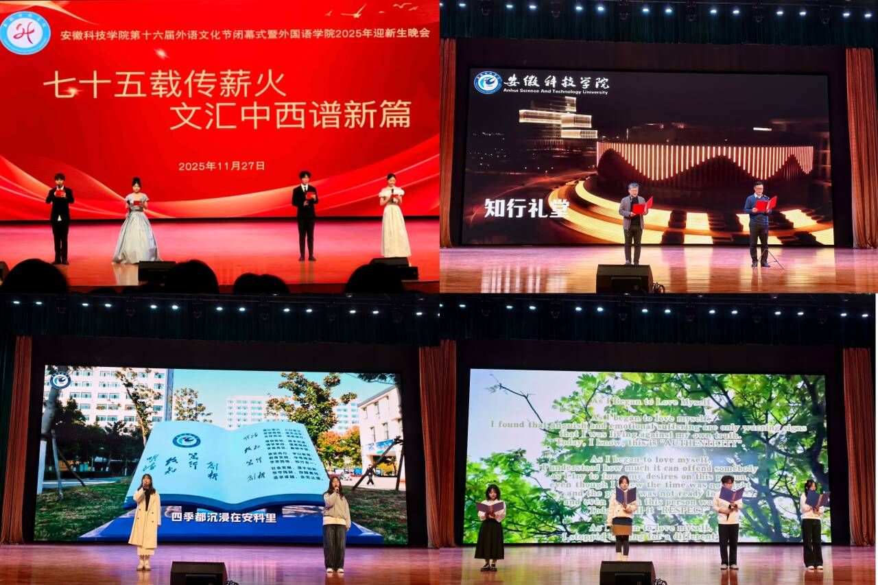 11月27日晚,我校第十六届外语文化节闭幕式暨外国语学院2025年迎新生晚会在知行礼堂举行。外国语学院党政领导、辅导员以及全体在校生参加活动。