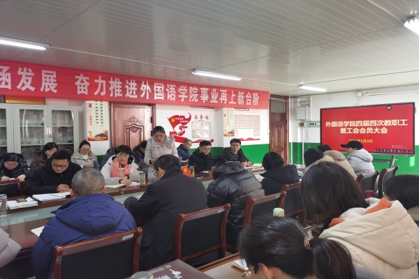 1月3日下午,外国语学院四届四次教职工暨工会会员大会在学院会议室举行。大会主题为“坚守初心 勇担使命 奋力开创外国语学院高质量发展新局面”,学院党委书记蔡为青主持会议,学院全体教职工参加会议。