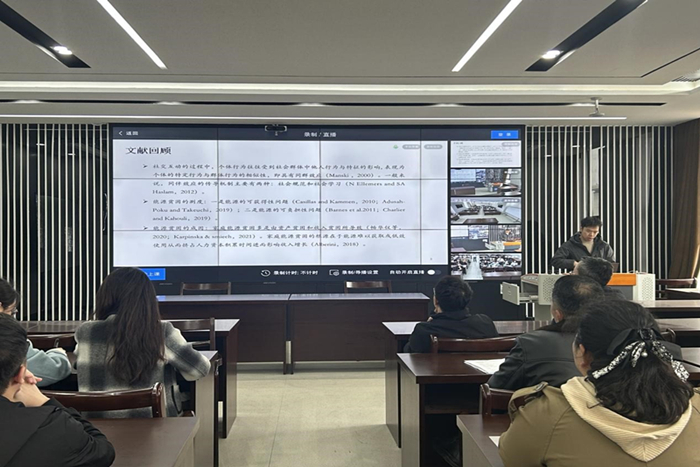 陈建做了题为“同群效应对中国农村家庭能源贫困的影响”的学术报告,探讨了同群效应是否以及如何影响中国家庭能源贫困。研究表明,家庭能源贫困显著受到同村其他家庭能源贫困程度的影响,即存在显著的同群效应。陈建从论文选题、文献综述、研究过程、方法选择等多方面进行了详细讲解,与会教师们对陈建的论文进行了点评,在交流中,教师们各抒己见,提出了诸多宝贵的修改建议,为论文的进一步完善提供了新的思路。