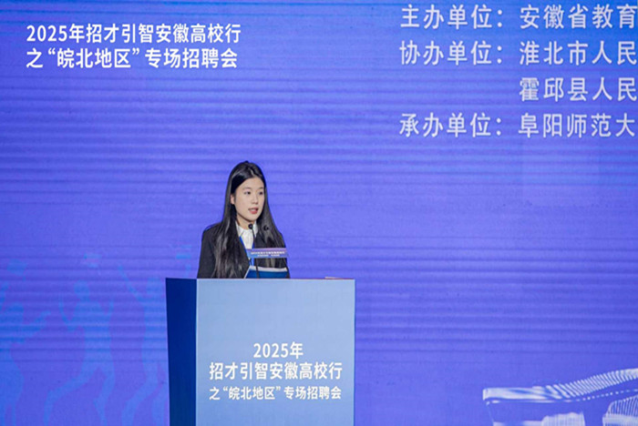 为促进高校毕业生高质量充分就业,3月22日,招才引智安徽高校行之“皖北地区”专场招聘会启动仪式在阜阳师范大学体育中心举行。安徽省委教育工委副书记范奇、安徽省人力资源和社会保障厅二级巡视员徐尚振等领导出席启动仪式,皖北六市四县的负责人和人社、教育、科技部门负责人,有关企事业单位负责人以及高校学生及毕业生代表参加启动仪式。启动仪式上,我校2025届生物工程专业顾东悦同学作为毕业生代表发言,她在发言中讲述了自己的成长经历,并立志留在皖北,为家乡的发展贡献力量。