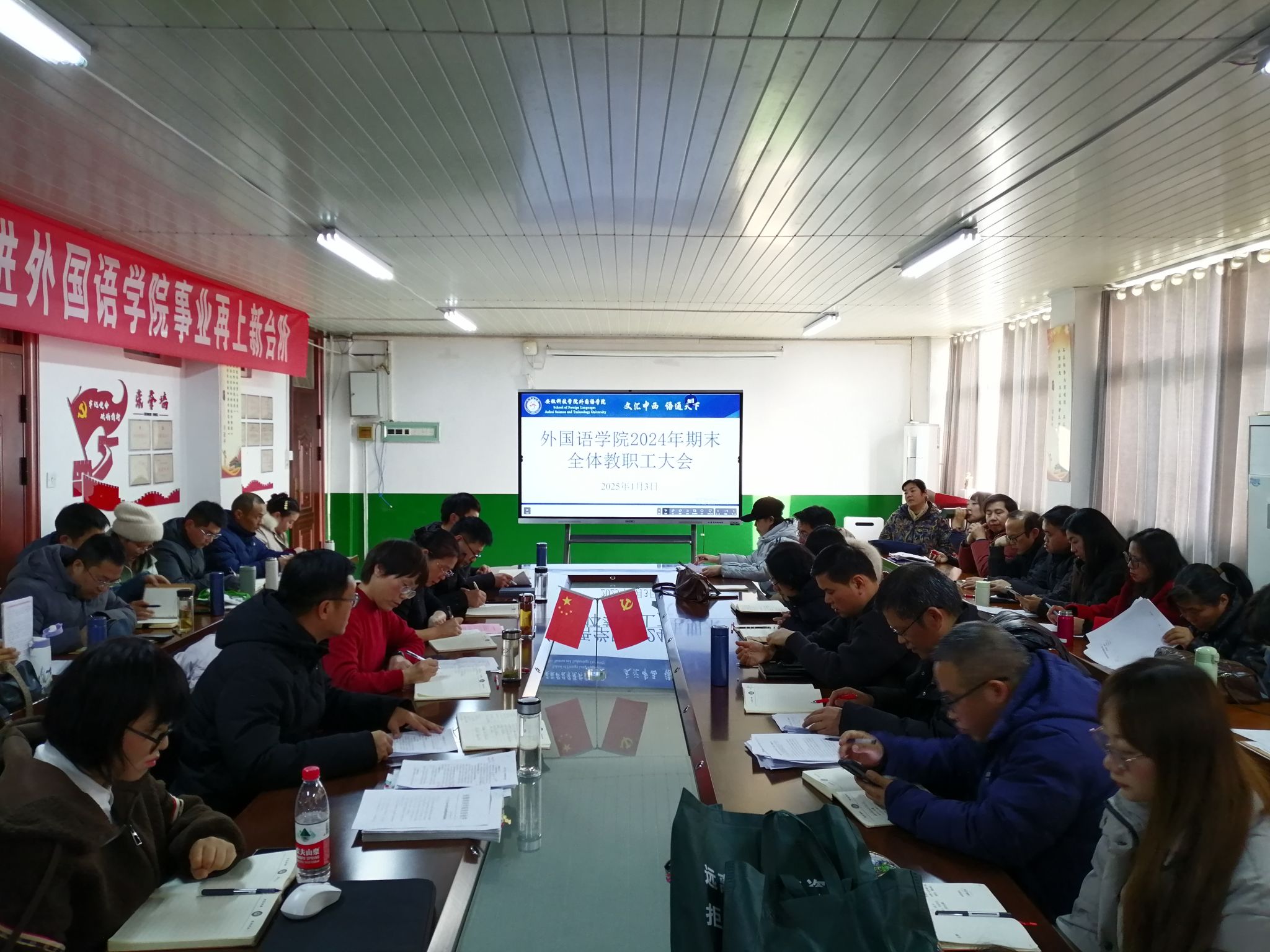 1月3日下午,外国语学院在学知楼五楼会议室召开期末全体教职工会议。外国语学院党政领导和全体教职工参加会议,会议由院长刘萍主持。