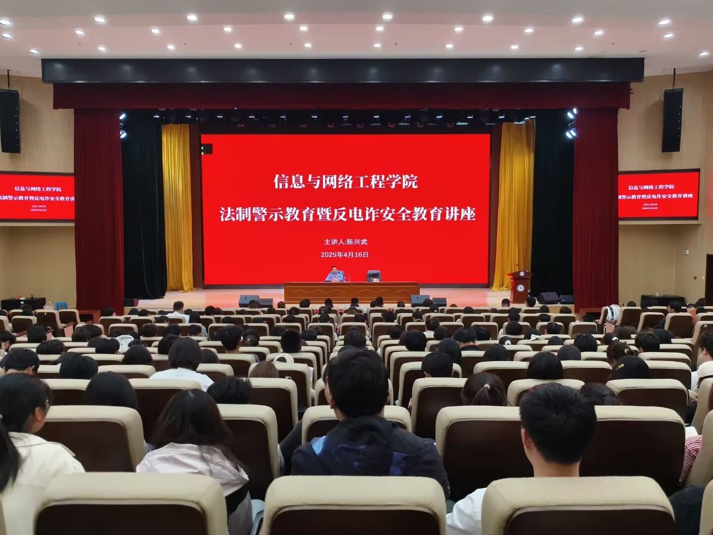 4月16日下午,信息与网络工程学院在东辅楼报告厅举办法制警示教育暨反电诈安全教育讲座。活动由学院党委副书记韦乃学主持,特邀蚌埠市高校警务工作室负责人、龙子湖公安分局110指挥中心主任陈兴武警官主讲,学院全体班委、寝室长参加。