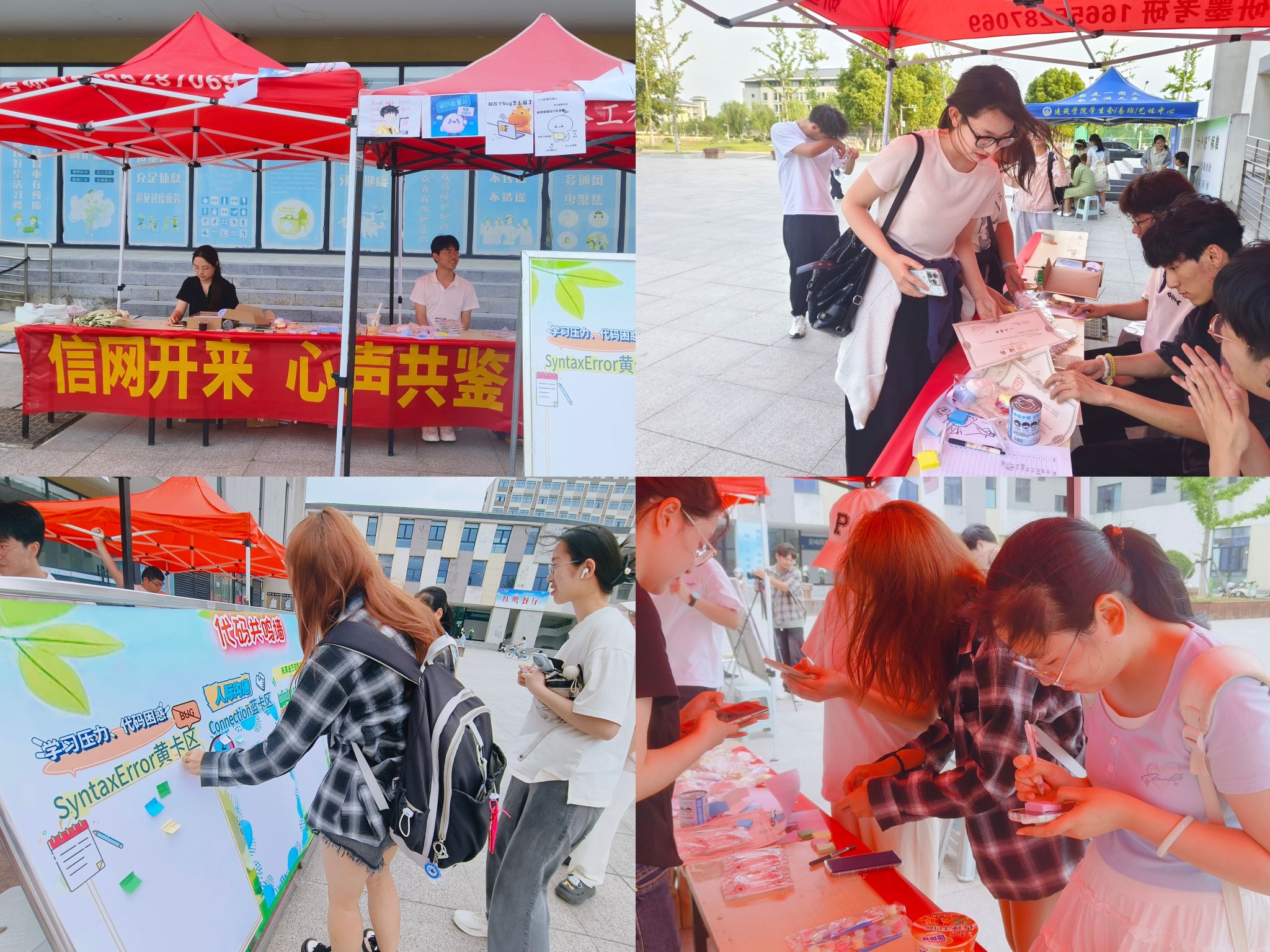 5月21日,学院在龙湖校区“一站式”社区服务中心前广场开展了以“信网开来,共鉴心声”为主题的心理游园会系列活动。此次游园会包含主线活动“代码共鸣墙”和支线活动“DIY手链——‘串起散落的情绪’”。本次活动的成功举办,不仅为同学们普及了心理健康知识,更以寓教于乐的创新形式,引导大家在轻松愉悦的氛围中构建积极向上、理性平和的健康心态,有效提升了活动的吸引力和教育实效。