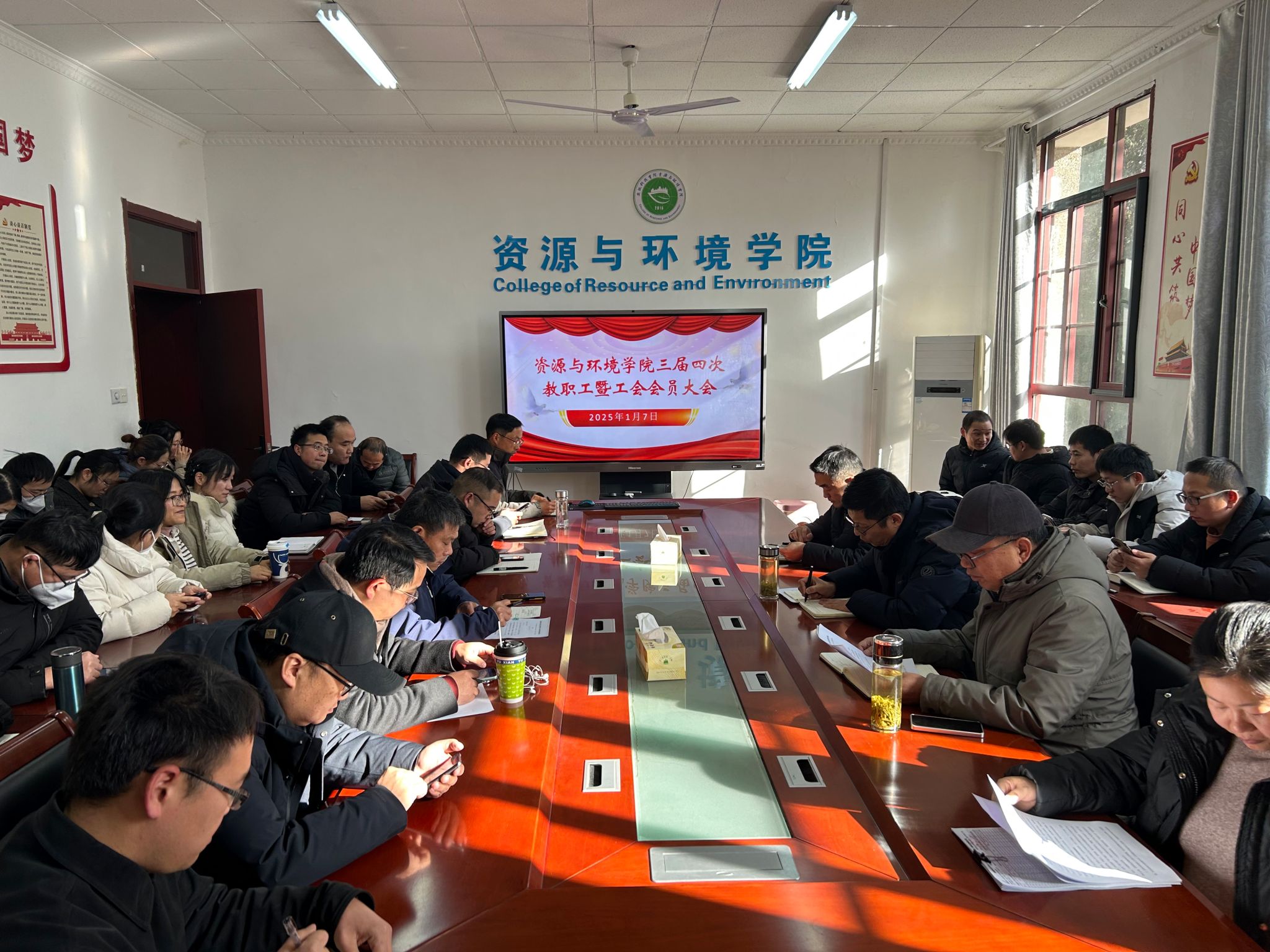 1月7日下午,资源与环境学院在东办公楼学院会议室召开三届四次教职工暨工会会员大会。会议由学院党委书记沈树周主持,学院全体教职工及工会会员参加会议。