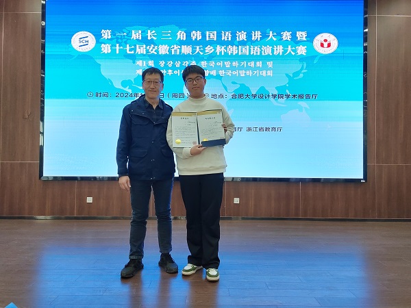 12月5日,由安徽省教育厅主办,上海市教育委员会、江苏省教育厅、浙江省教育厅指导的第一届长三角韩国语演讲大赛暨第十七届安徽省顺天乡杯韩国语演讲大赛在合肥大学顺利举办。合肥大学党委副书记、校长任永,顺天乡大学副校长金龙夏,安徽省教育厅外事处处长姚德勇,合肥大学国际交流合作处处长张慧等出席大赛开幕式。来自南京大学、上海外国语大学、杭州师范大学、安徽师范大学等22所高校25位选手入围,我校1人获得参赛资格。经过激烈角逐,我校机械设计制造及其自动化231班孙天持同学获得最佳原稿奖。