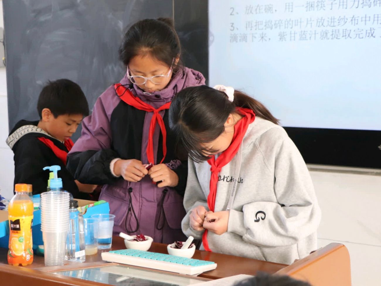 在志愿者的指导下,学生们亲自动手参与了实验过程。他们小心翼翼地撕碎紫甘蓝叶片,用研钵捣碎并提取出紫甘蓝溶液。接着,学生们将紫甘蓝提取液分别滴入酸性、碱性和中性溶液中,仔细观察并记录下了颜色变化。在实验过程中,学生们积极讨论,踊跃发言,分享自己的发现和心得。