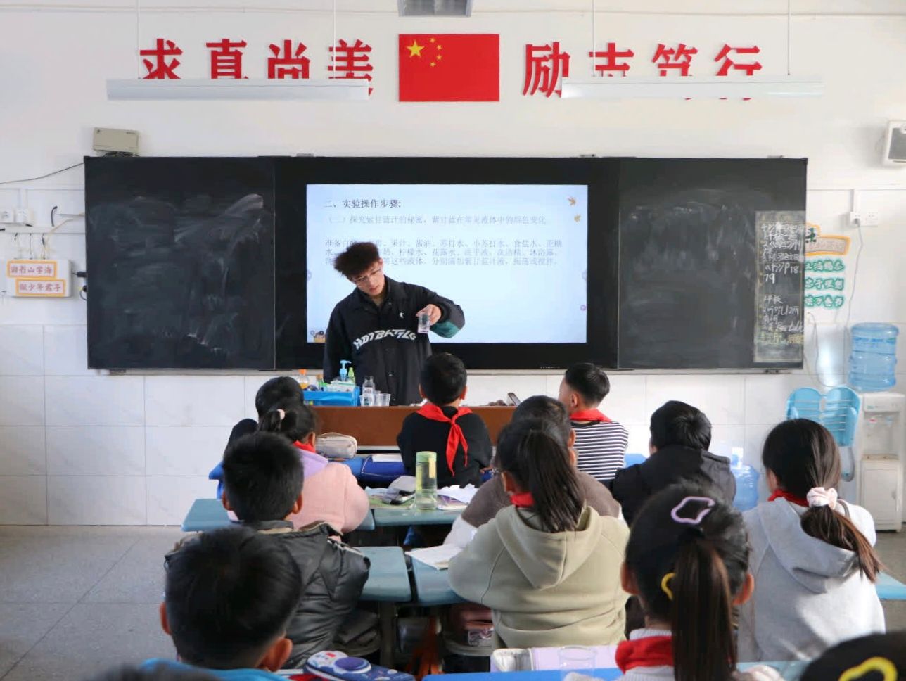 在活动中,支教小分队的志愿者们精心准备了一场别开生面的科学课程,通过实践探索紫甘蓝溶液与不同液体混合后的色彩变化,带领学生们走进科学的奇妙世界。