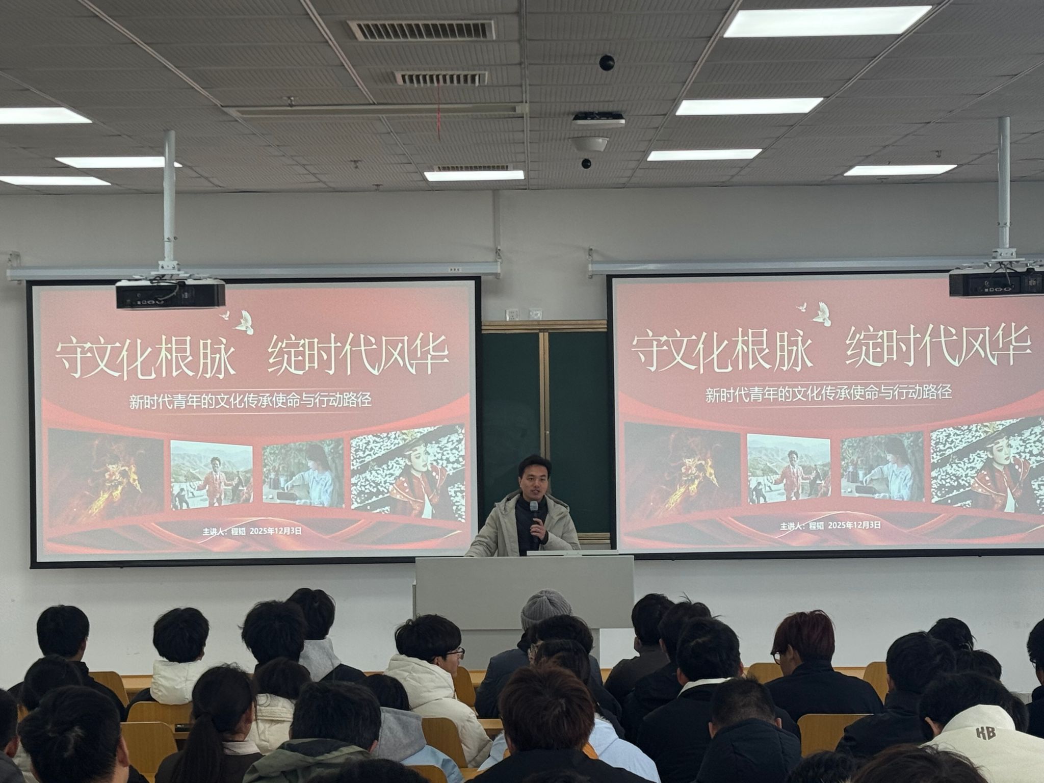 程韬以《守文化根脉,绽时代风华——新时代青年的文化传承使命与行动路径》为主题,从“文化赓续弦歌不辍、文艺创作气象恢弘、文明活力激扬澎湃、文化传承青年有为”四个维度展开系统阐述。他结合古今实例,旁征博引,引导学生深刻理解文化传承与时代责任的内在联系,强调新时代青年应在坚守传统与开拓创新中实现价值自觉。