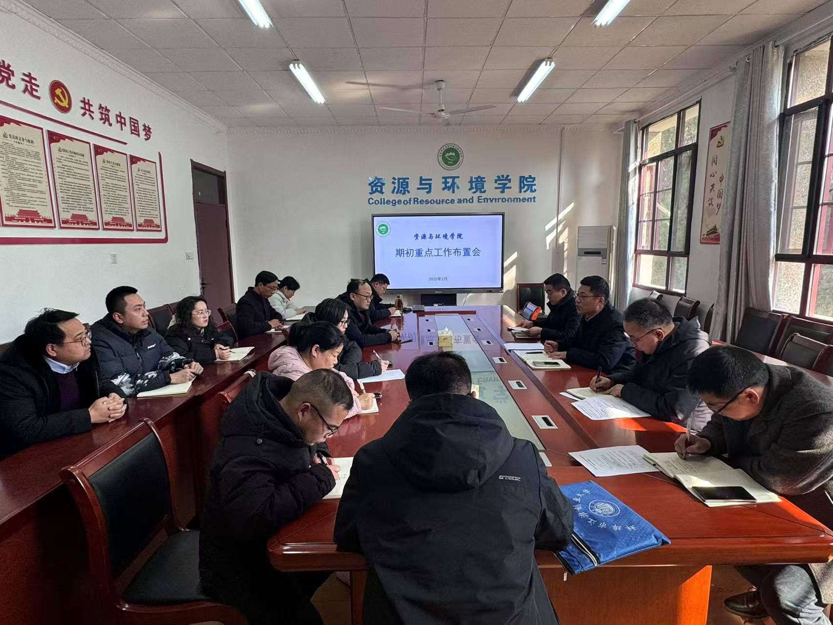 2月19日下午,资源与环境学院在学院会议室召开期初重点工作布置会,全面部署新学期各项重点工作任务,确保全年工作开好局、起好步。学院党政领导、各系主任、实验室主任、支部书记参加会议。会议由学院党委书记沈树周主持。