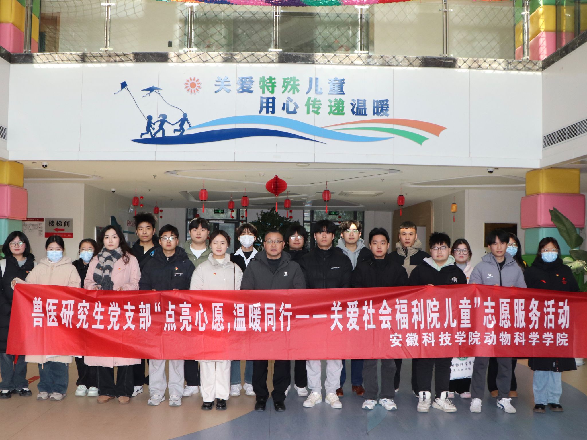 为关爱困境青少年儿童,发挥党员先锋模范作用,1月11日,动物科学学院兽医研究生党支部20名党员和入党积极分子赴蚌埠市社会福利院开展“点亮心愿,温暖同行——关爱社会福利院儿童”志愿服务活动。