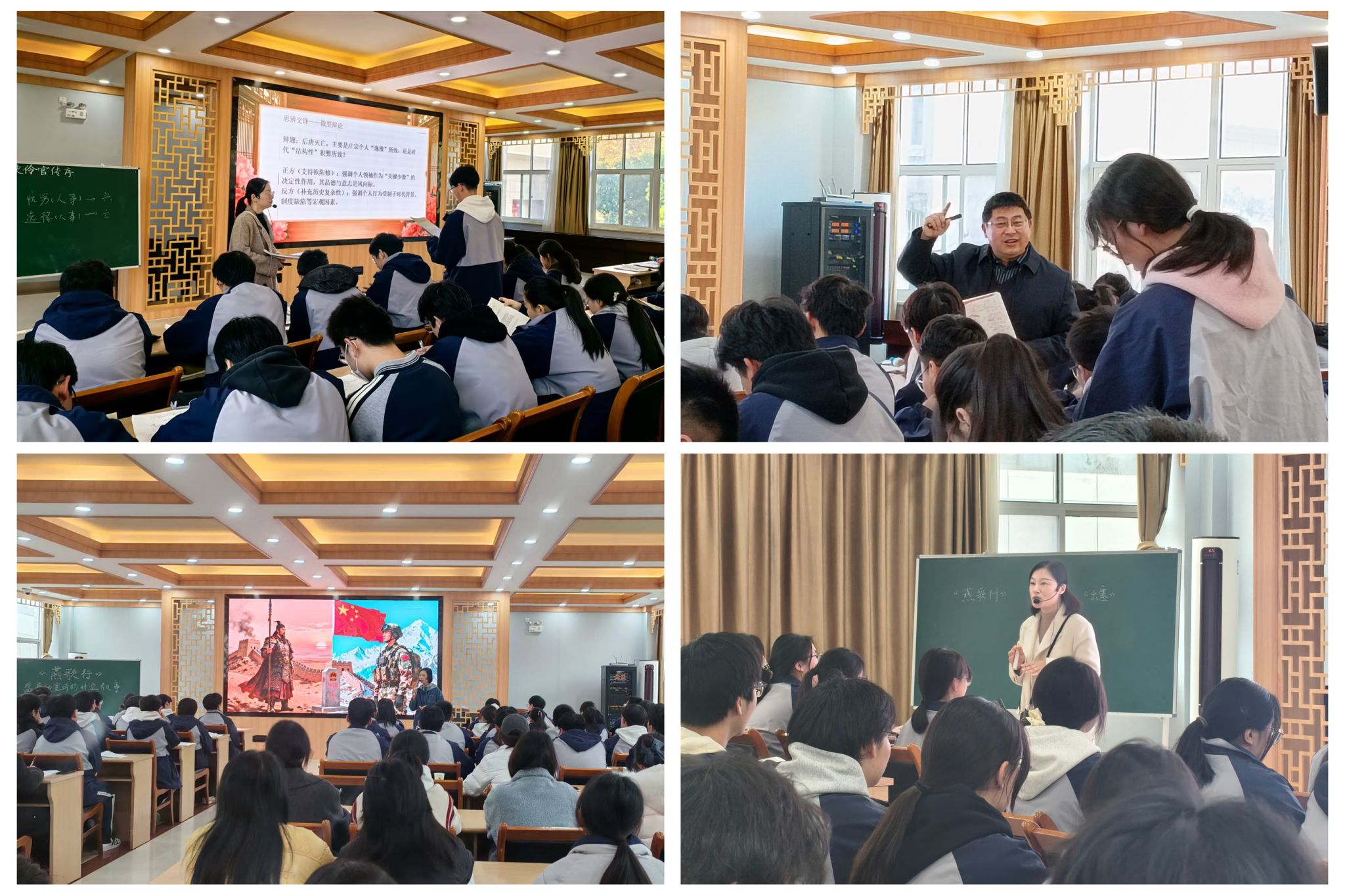 学生分别参与《伶官传序》同课异构和盛唐边塞诗联读鉴赏教学观摩。钱玲老师以“庄宗亡国根源”微型辩论激活课堂,陈宝昌老师用任务驱动式解读引导学生深剖文本,严媛老师融合AI技术、背景音乐与“艺术时空”主线讲授《燕歌行》,陈国芝老师通过典故引入、AI诗歌朗诵评价与分组诵读带学生赏析《出塞》。四位教师的不同教学风格,让学生直观感受经典课文的多元教学设计。