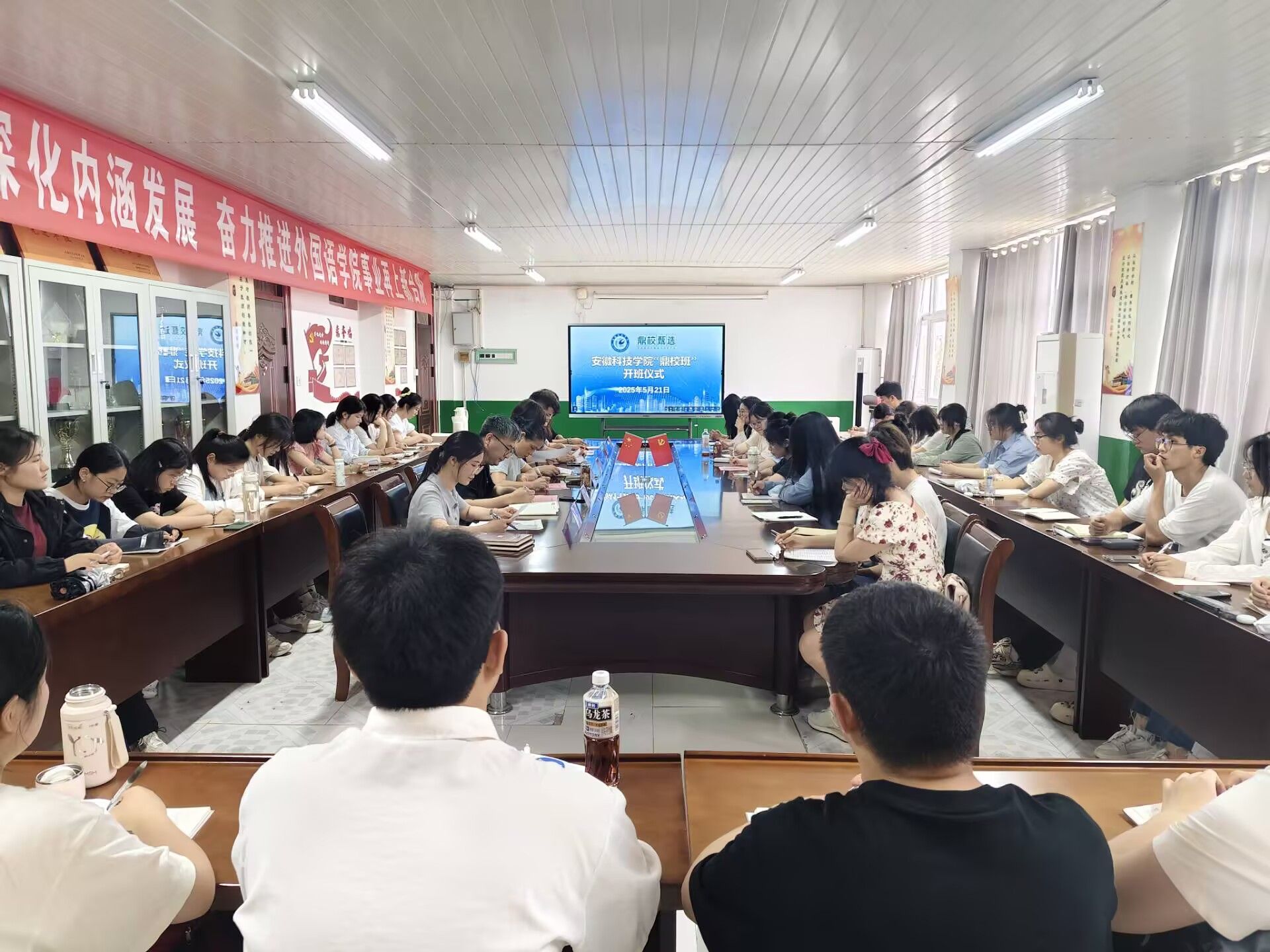 5月21日下午,我校“鼎校班”开班仪式在外国语学院会议室举行。外国语学院党政领导、安徽鼎校教育科技有限公司(以下简称“鼎校教育”)相关负责人以及“鼎校班”40名学员参与活动。开班仪式由学院党委副书记张海亮主持。