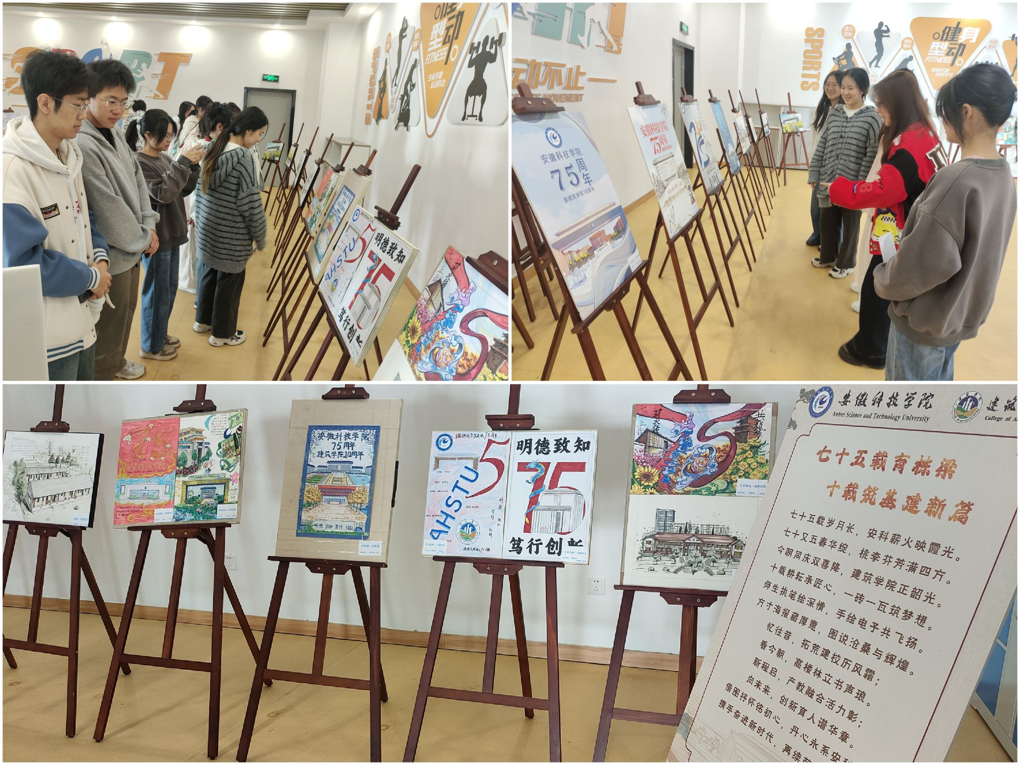 参展作品以图文结合的方式呈现,聚焦安徽科技学院75年来的办学历程和建筑学院10年的发展足迹。有的作品回顾了学校发展中的重要节点,有的记录了学院成长中的难忘瞬间。同学们用简洁的文字和清晰的视觉设计,表达对校园生活的观察与思考。这些作品既体现了基本的设计能力,也流露出对学校和学院发展的关注。观展师生在驻足观看的过程中,不仅了解了校院的发展脉络,也在细节中感受到一种真实而朴素的情感共鸣。