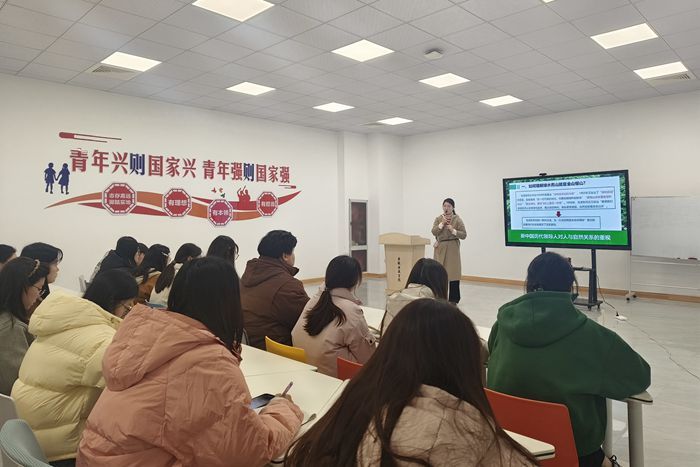 讲座特邀马克思主义学院教师邵蓉蓉担任主讲。她以“绿色发展与美丽中国”为主题,聚焦“绿水青山就是金山银山”这一核心命题,围绕“何以阐释,何以两全,何以实现”三大模块展开系统讲解,构建起“理论认知—案例佐证—实践指引”的完整闭环。通过丰富案例与深入浅出的讲解,引导学生准确把握“两山”理论的内涵要义,破除认识误区,深刻理解“保护是发展的前提,发展是保护的动力”的内在逻辑,并进一步厘清政府、企业及个人在生态文明建设中的责任与行动方向,启发学生将理论认知转化为校园生活与社会实践中的自觉行为。讲座尾声,邵老师通过核心内容梳理与开放性任务设计,进一步巩固学习成效、拓宽思考维度,切实推动“知、信、行”有机统一。