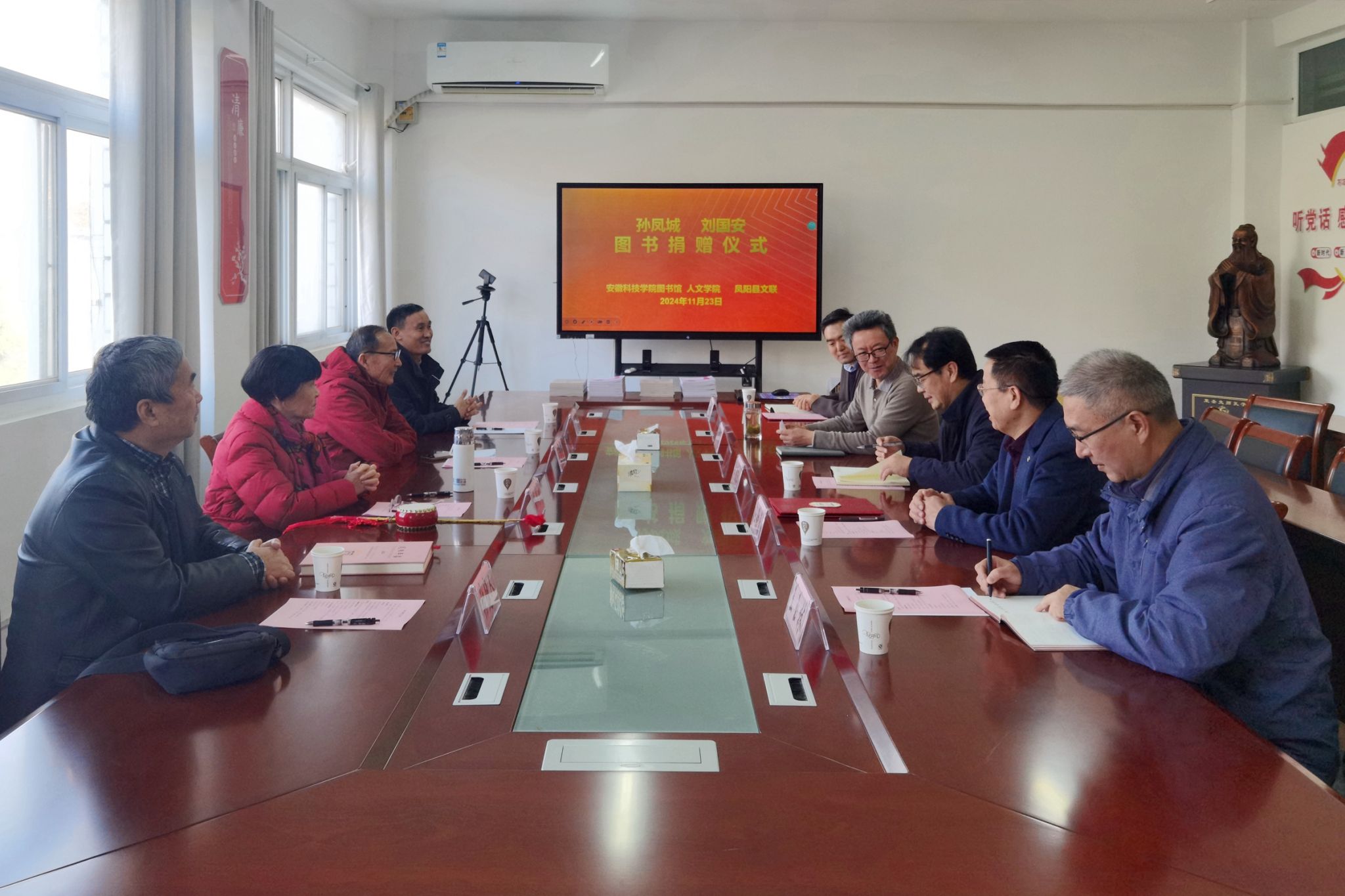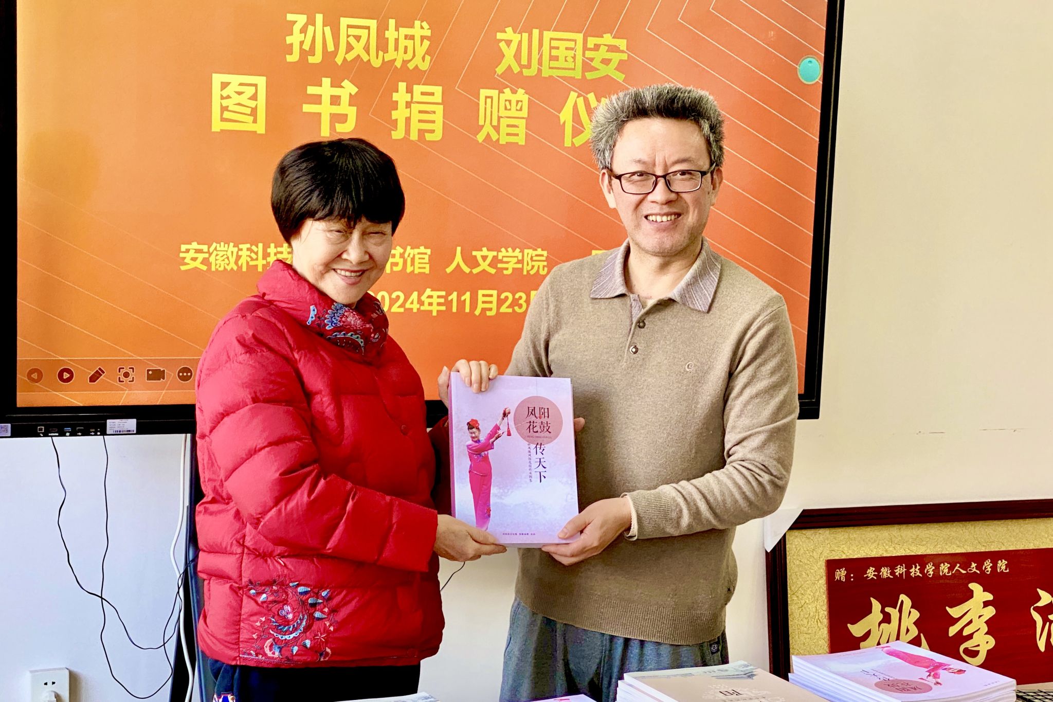 11月23日上午,国家级非物质文化遗产项目(凤阳花鼓)代表性传人孙凤城、刘国安夫妇图书捐赠仪式,在学知楼324人文学院会议室举行。安徽科技学院客座教授——国家级非物质文化遗产项目(凤阳花鼓)代表性传承人孙凤城和凤阳电视台原副台长、安徽电视台特约记者、中国摄影家协会安徽分会会员刘国安,凤阳县文联主席陈友田,凤阳县教体局原副局长、凤阳年鉴主编张建人;人文学院院长、明文化研究会会长李晓东,图书馆馆长汪徐春、副馆长王玉林,人文学院中文系副主任、明文化研究会秘书长周广超参加相关活动。捐赠仪式由人文学院正处级组织员张严政主持。