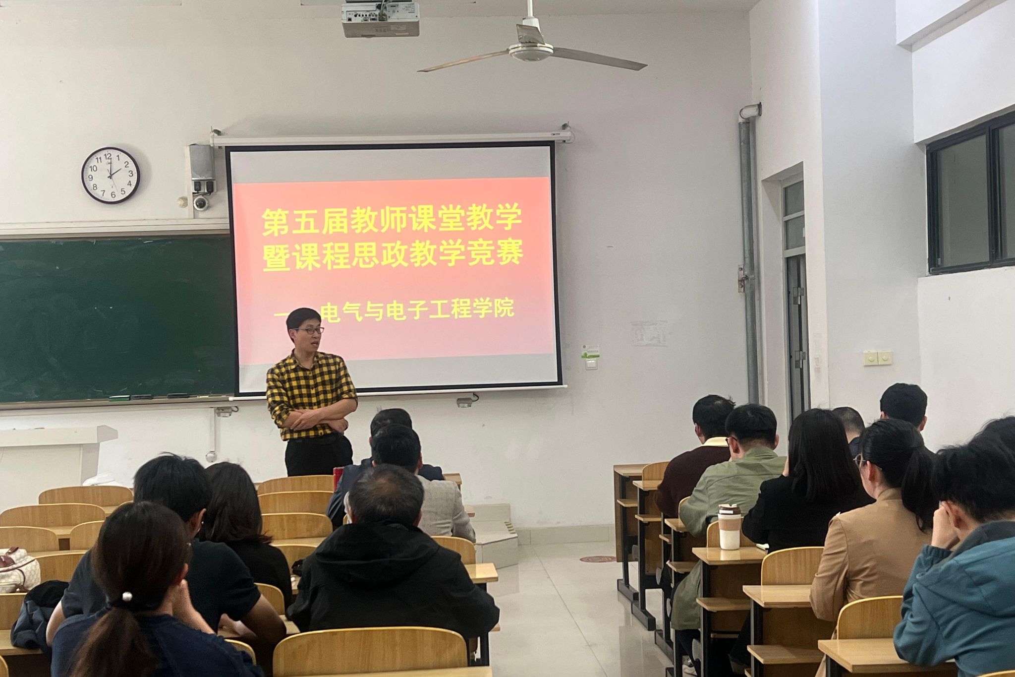 4月13日,电气与电子工程学院在致知楼C开展第五届教师课堂教学暨课程思政教学创新大赛。学院院长夏显明,副院长国海,副院长樊晓宇和全体近三年入职的青年教师全程参加本次比赛活动。