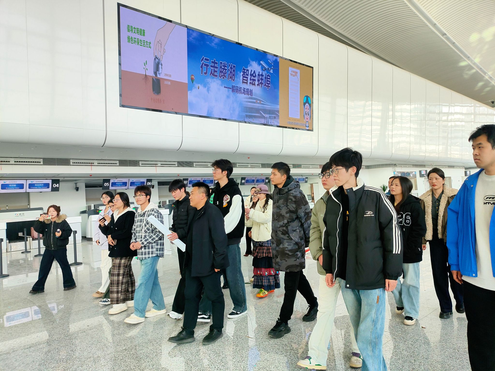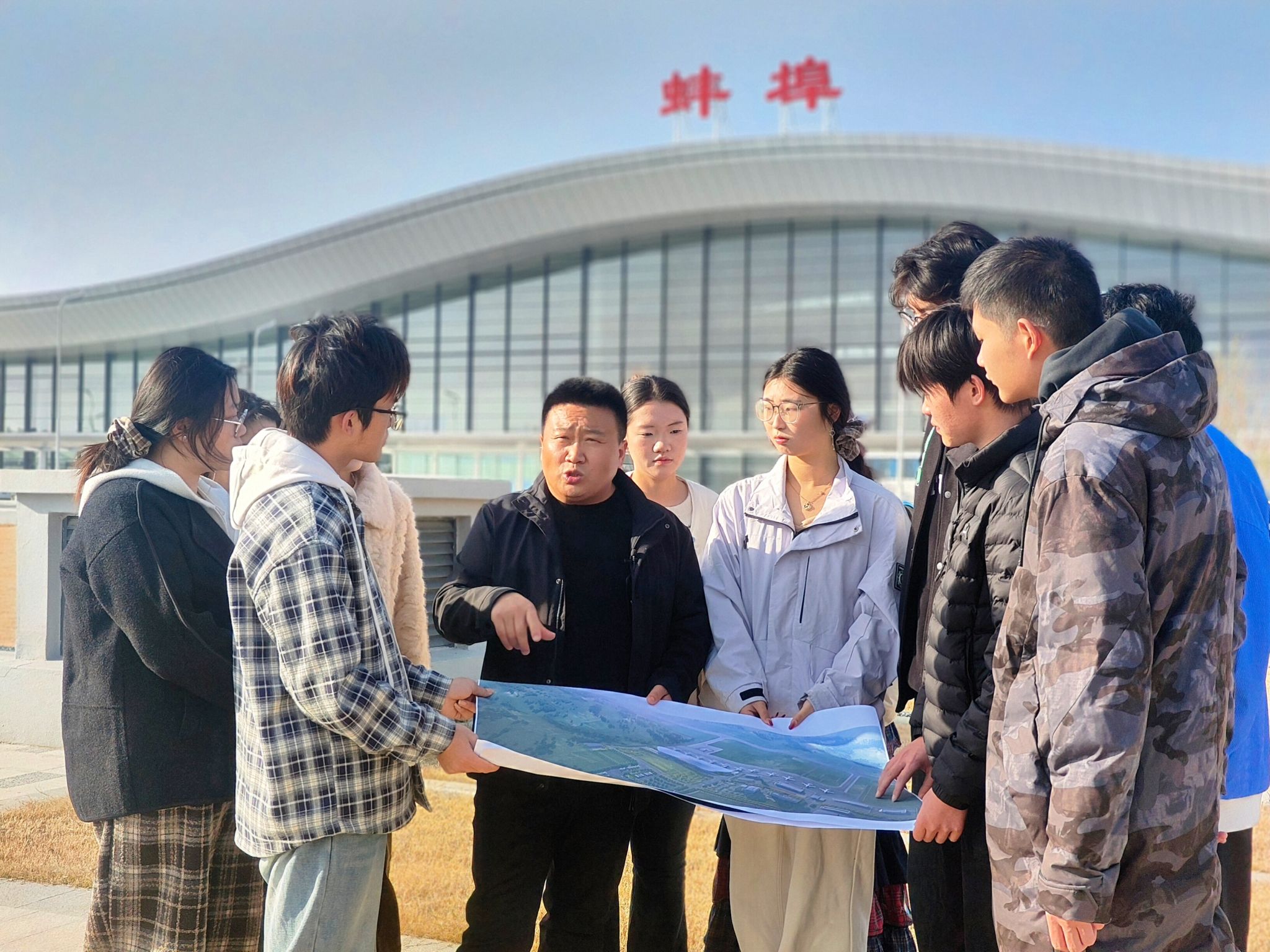 人民城市人民建,人民城市为人民。11月28日,“行走滕湖,智绘蚌埠——解码机场规划”暨“政风行风热线”进社区活动在蚌埠滕湖机场圆满举行。作为联合承办单位之一,建筑学院组织志愿者团队全程参与,学院党委副书记谢宜勤、副院长张伟、团委书记沈德艳共同参加活动。师生们以专业讲解、志愿服务与直播互动的多元形式,为这场城市规划科普活动注入青春动能,展现了安科青年扎根实践、服务城市的责任担当。