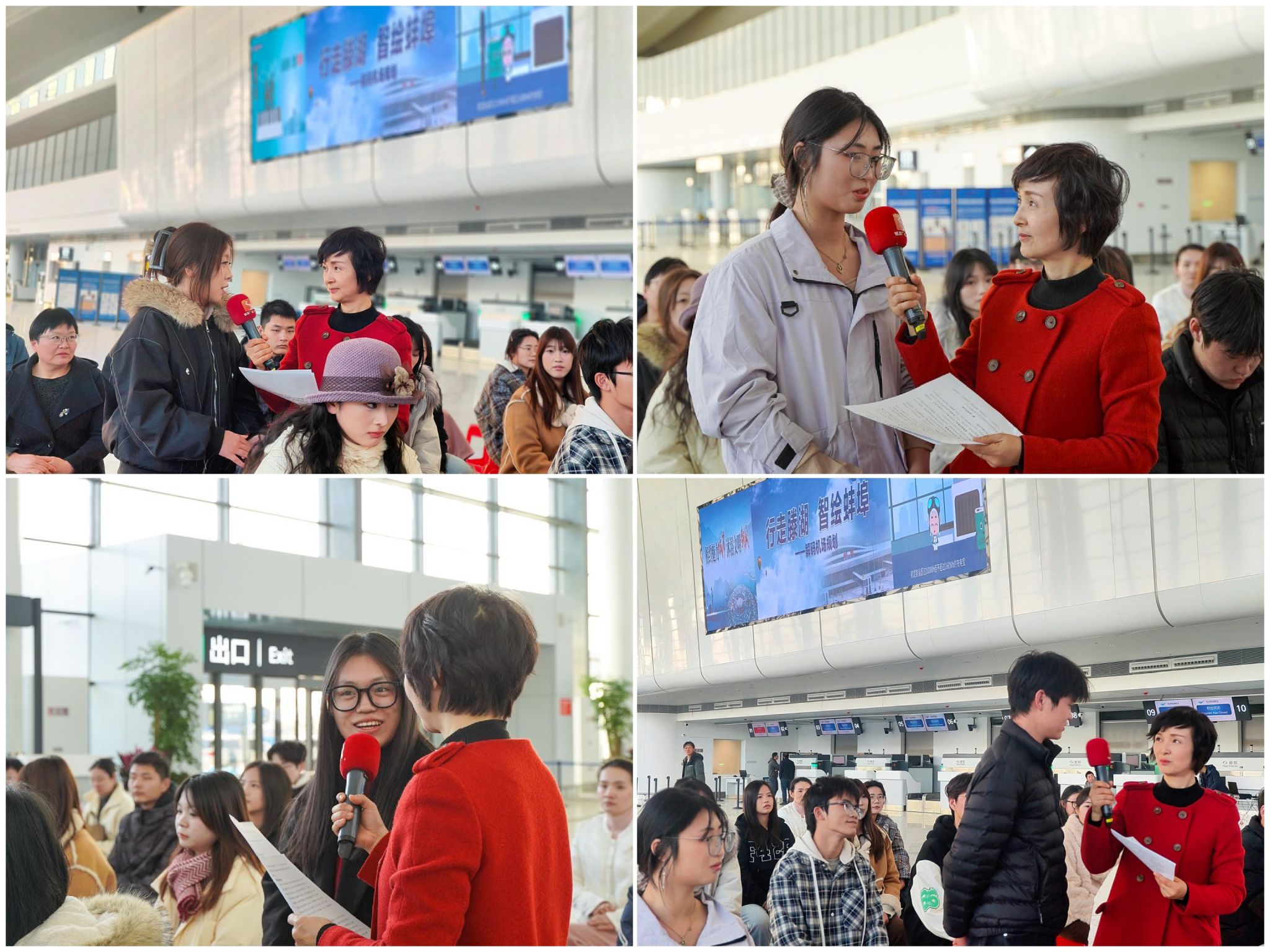 在航站楼内,蚌埠综合广播《政风行风热线》特别节目的直播现场,志愿者们不仅作为观众认真聆听专家分享,更主动走上互动环节,结合实地参观感悟与专业知识,向现场嘉宾互动交流。来自城乡规划专业的志愿者侯姝婧感慨道:“这座机场的每一处设计都凝聚着规划者的智慧,未来我也希望能运用专业知识,为家乡的建设贡献自己的力量。”